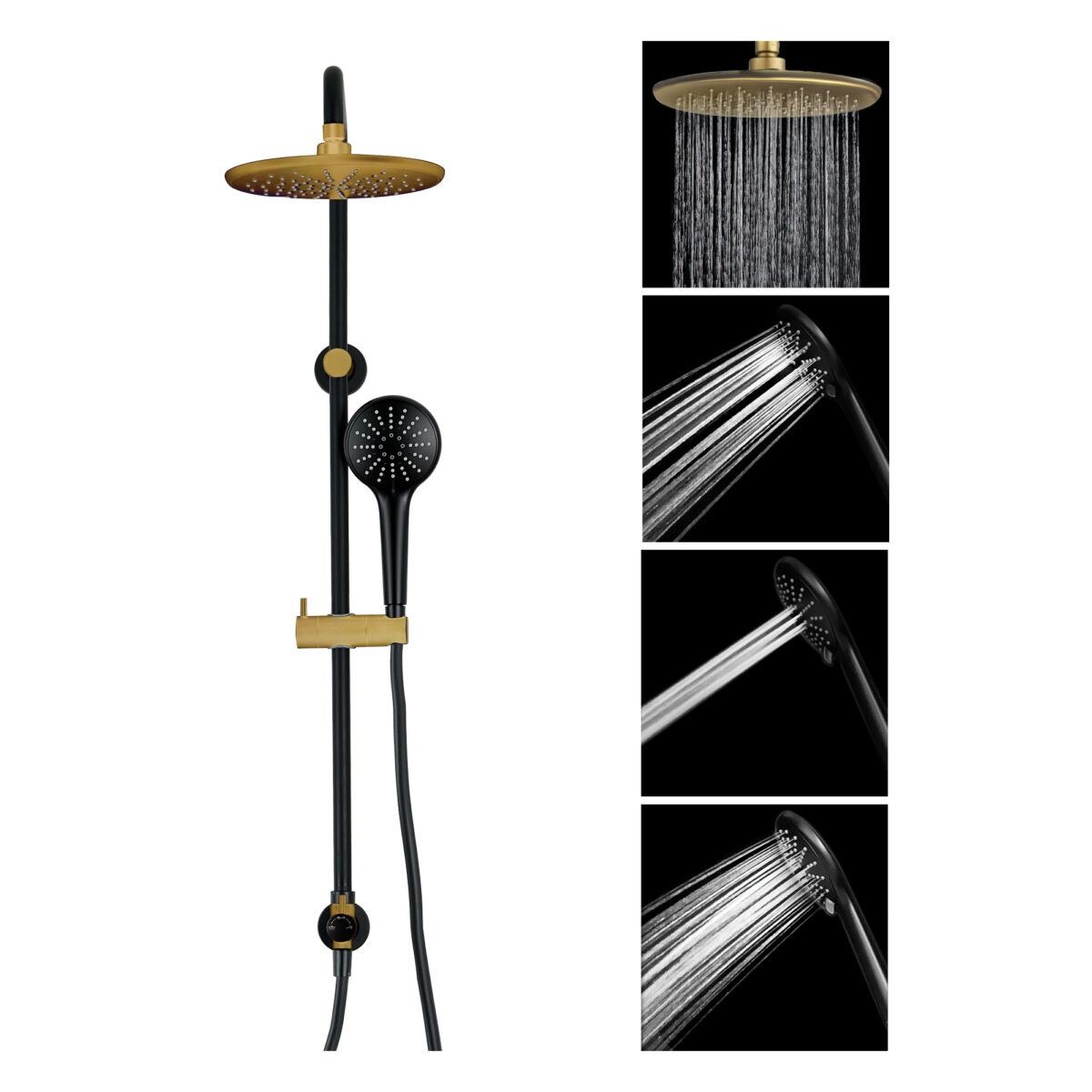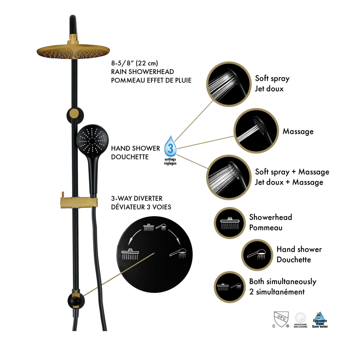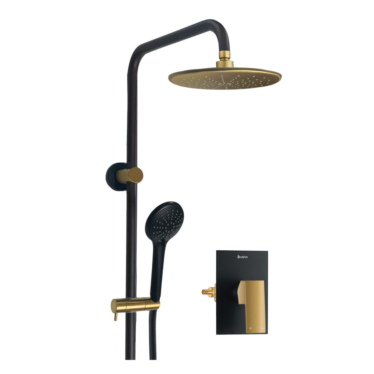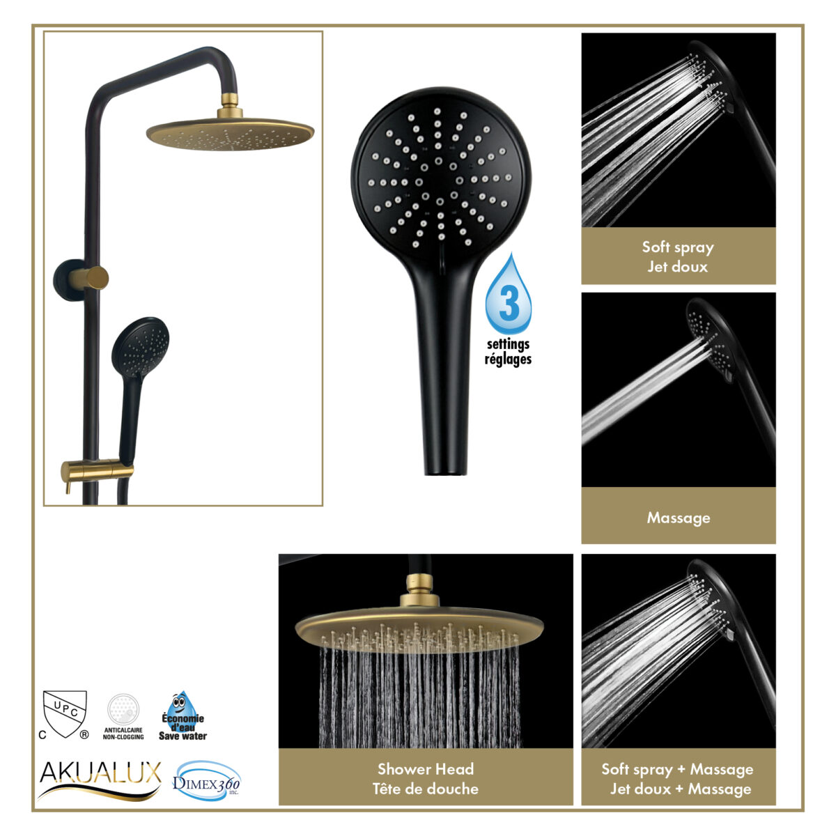 AKUALUX® 3-Way pressure balance Shower system with valve featuring an 8-5/8 inches (22 cm) swiveling rain Showerhead, and a 3-setting handheld Shower in a matte black and brushed champagne gold finish.