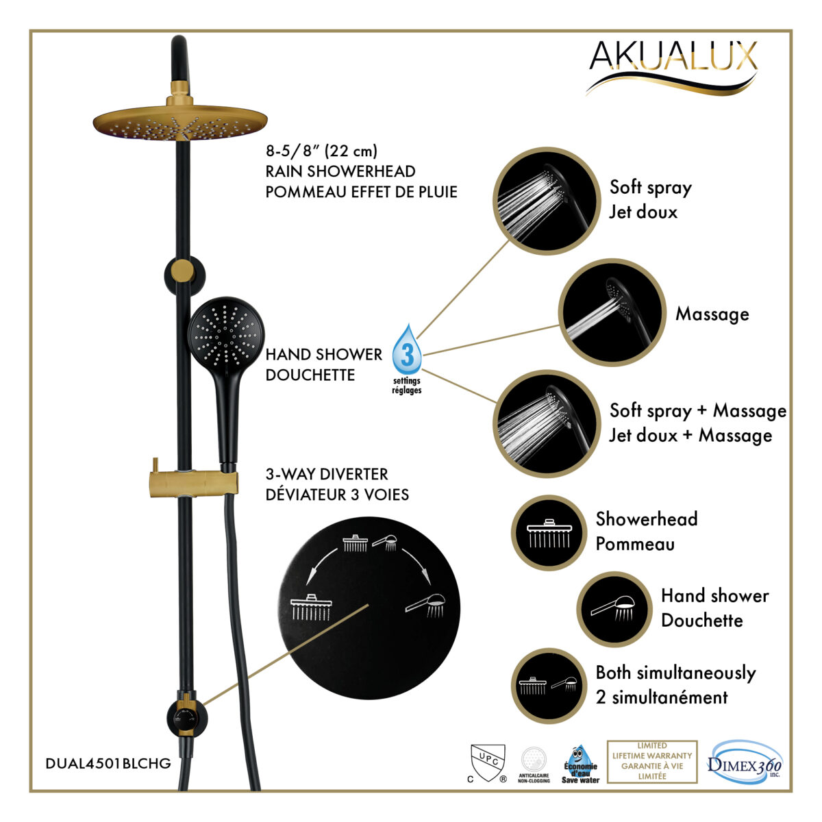 The AKUALUX® pressure balance shower post system is designed to deliver stability, performance, and durability for modern residential bathroom installations. The shower valve, made of brass, stainless steel, and zinc, features a pressure balance cartridge that maintains consistent water temperature while minimizing sudden pressure fluctuations. It includes a single handle for precise flow and temperature control. The water inlet is compatible with a 1/2" PEX connection and includes an integrated stop valve for secure and dependable installation. The system includes a 35 3/8" (90 cm) brass shower post with an adjustable ABS hand shower bracket. The water inlet is located at the upper wall connection point, allowing for a clean and integrated shower column installation. A 3-way diverter allows use of the showerhead, the hand shower, or both simultaneously. The 8" (20.32 cm) ABS swiveling showerhead provides optimal coverage. The 3-setting ABS hand shower features easy-to-clean anti-limescale nozzles for simplified maintenance. The 59" (1.5 m) flexible PVC hose with brass fittings ensures flexibility and durability. Maximum flow rate is 9.5 L/min (2.5 US gal/min). Designed for residential applications, this system is cUPC certified, ensuring compliance with North American plumbing standards. Product offered exclusively at Costco.