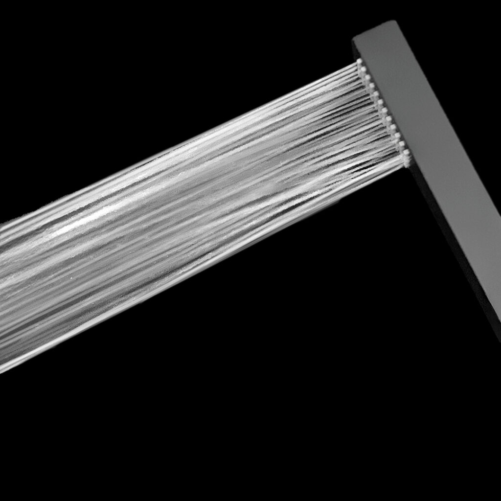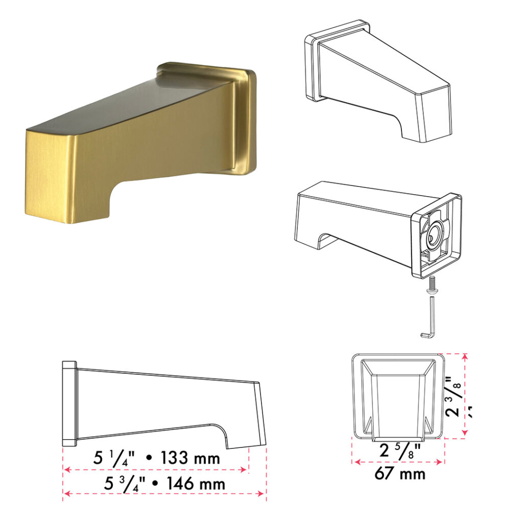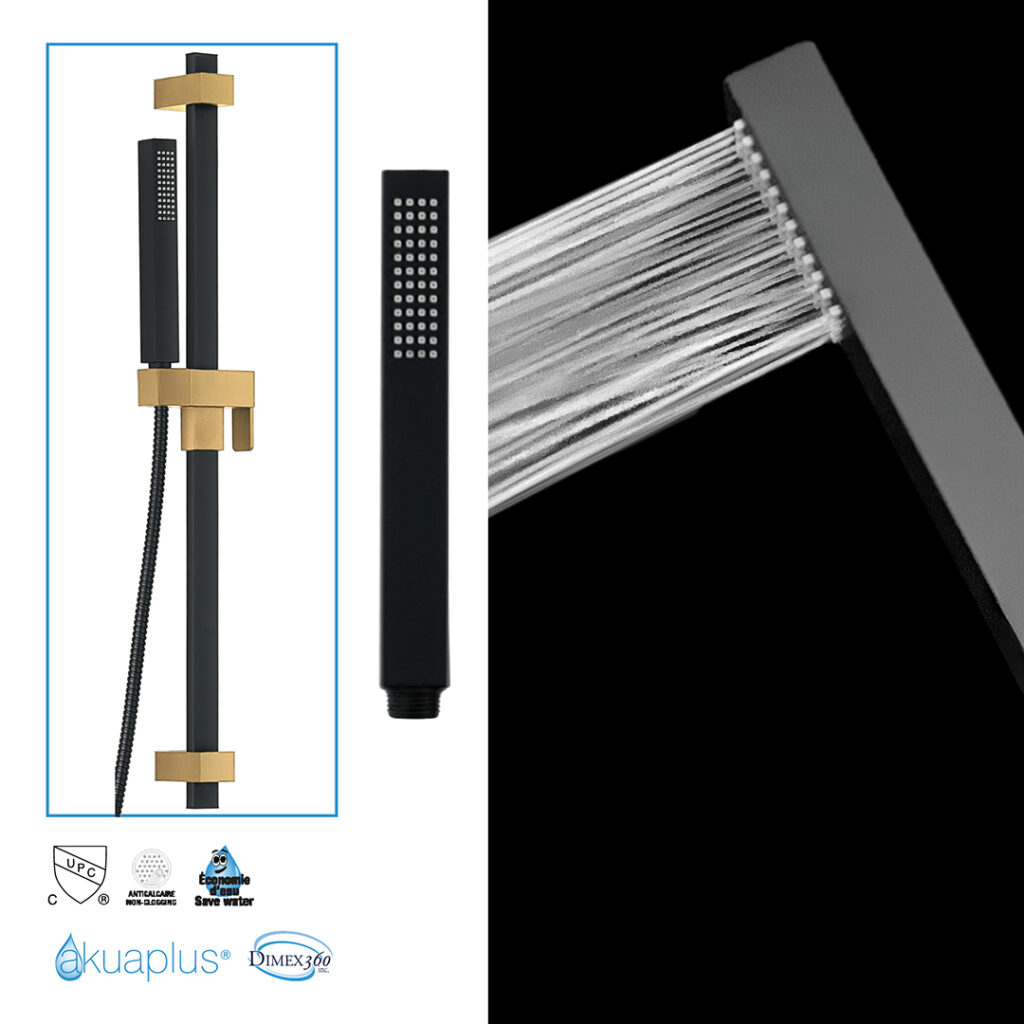 Square thermostatic Bath-Shower set with a 29 3/4 in. (75.5 cm) stainless steel wall mount post, 1-setting handheld Shower, and a 5 1/4 in. (13.3 cm) slip-on Bath spout in a matte black and brushed champagne gold finish.