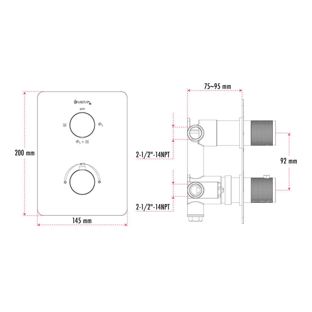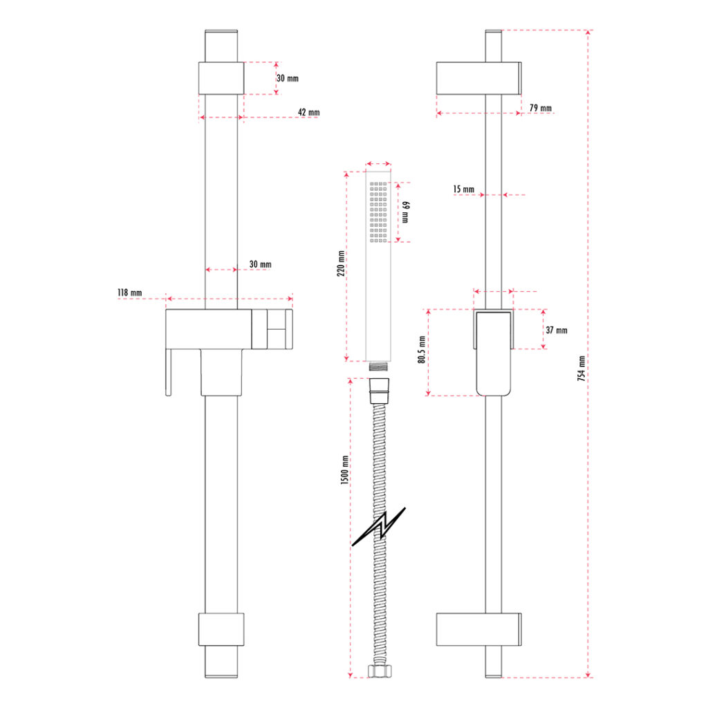 SQUARE THERMOSTATIC BATH-SHOWER SET: Valve made of brass with thermostatic cartridge; 4-way diverter (handheld shower, bath spout, both simultaneously or off); 31-1/2 inch (80 cm) stainless steel wall mount shower post with adjustable ABS handheld shower bracket; 1-setting ABS handheld shower with easy-to-clean anti-limescale nozzles; Flexible 59-inch (1.5 m) double interlocking stainless steel hose with brass fittings; Brass elbow fitting; Slip-on 5-1/4 inches (13.3 cm) bath spout made of zinc; Flow rate of 9.5 L/min (2.5 US gal/min).