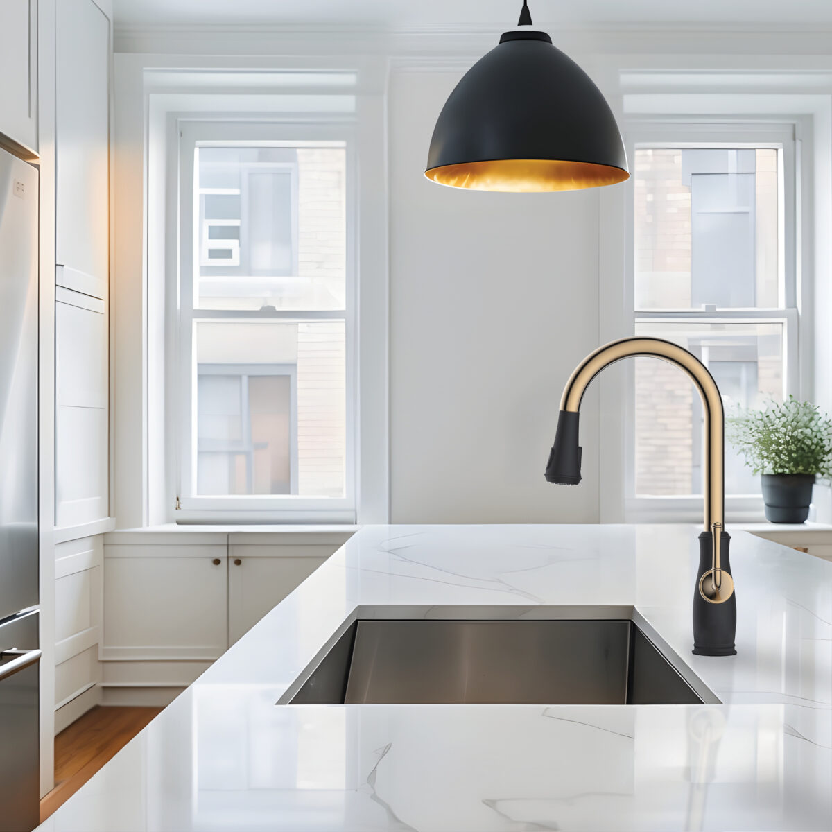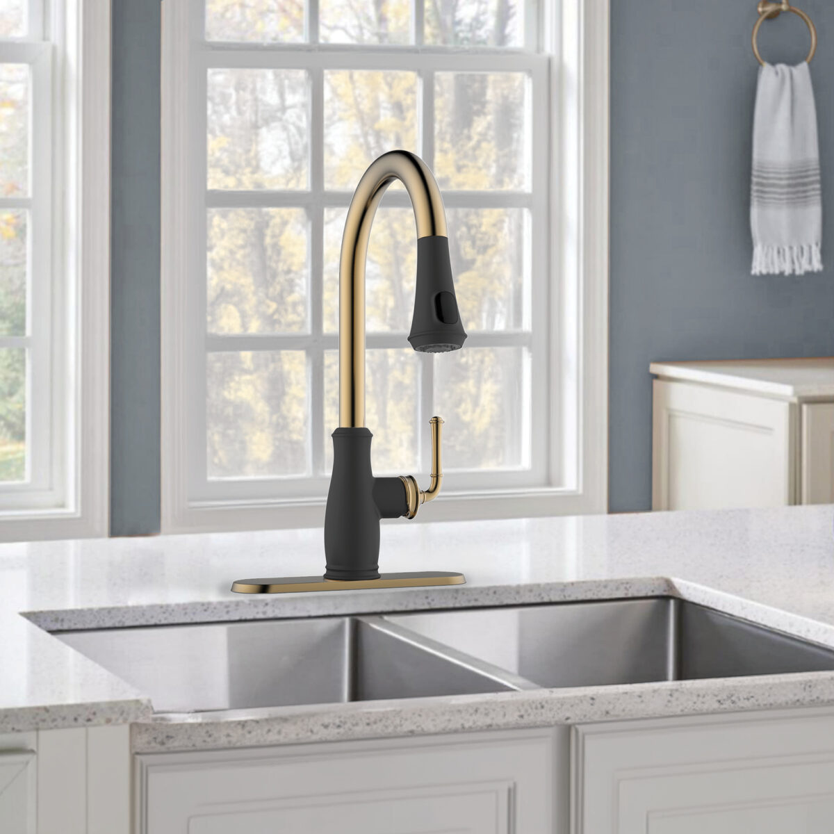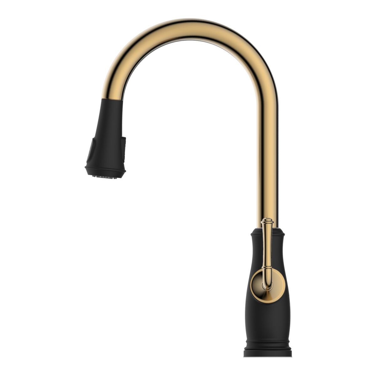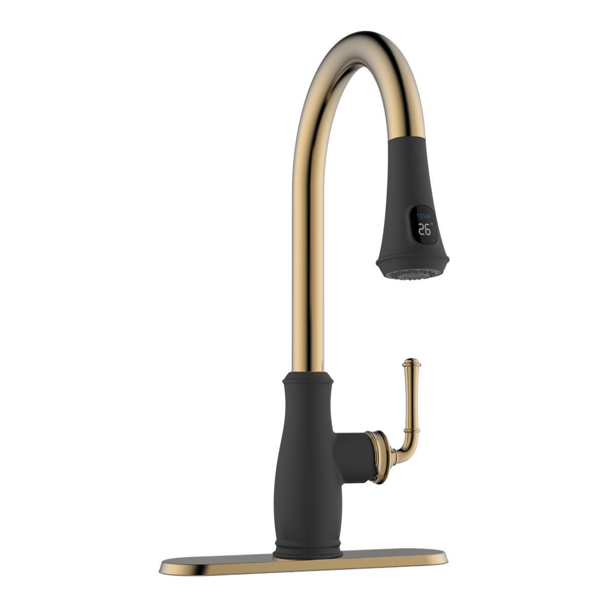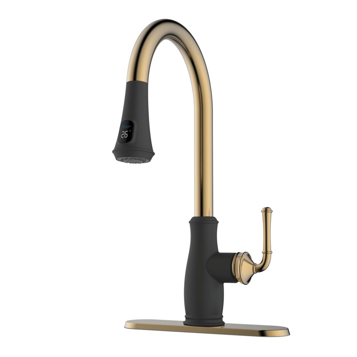 Pull-Down Kitchen Faucet with temperature Digital Display in a matte black and Champagne Gold finish.