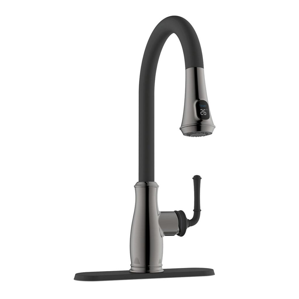 SINGLE-HOLE KITCHEN FAUCET: 2-way pulldown sprayer with smooth retraction and digital temperature display; 360° adjustable swivel spout; Easy-to-clean anti-limescale nozzles; Ceramic cartridge; Single lever for water volume and temperature control; Nylon braided hose; Flow of 6.81 L/min (1.8 US gal/min); Easy installation; Cover plate included.