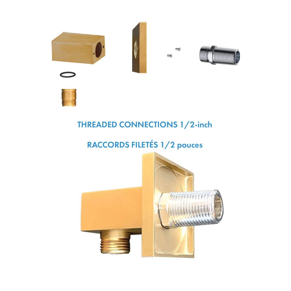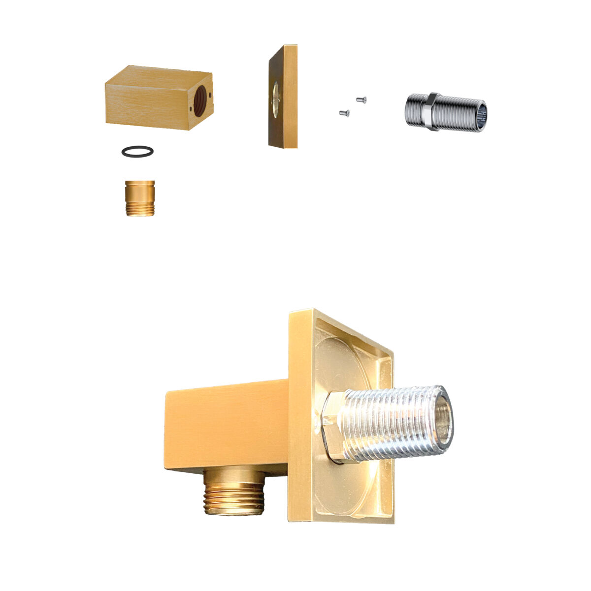 The AKUALUX® square elbow fitting is made of durable brass, providing strength and corrosion resistance. Designed for residential plumbing applications, it features 1/2" NPT male × male threaded connections, ensuring secure, watertight installation and compatibility with North American plumbing standards. The square trim plate measures 2 3/8" × 2 3/8" (6 × 6 cm), delivering a clean, modern look and seamless integration into contemporary shower and bath systems. This product is cUPC certified, ensuring compliance with North American plumbing standards.