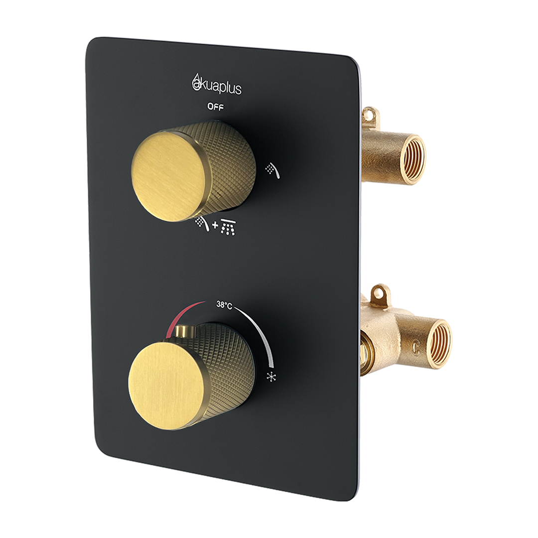 THERMOSTATIC SHOWER VALVE: Made of brass; 4-way diverter (the one, the other, both simultaneously or off); Thermostatic cartridge; Square cover plate and round knobs.