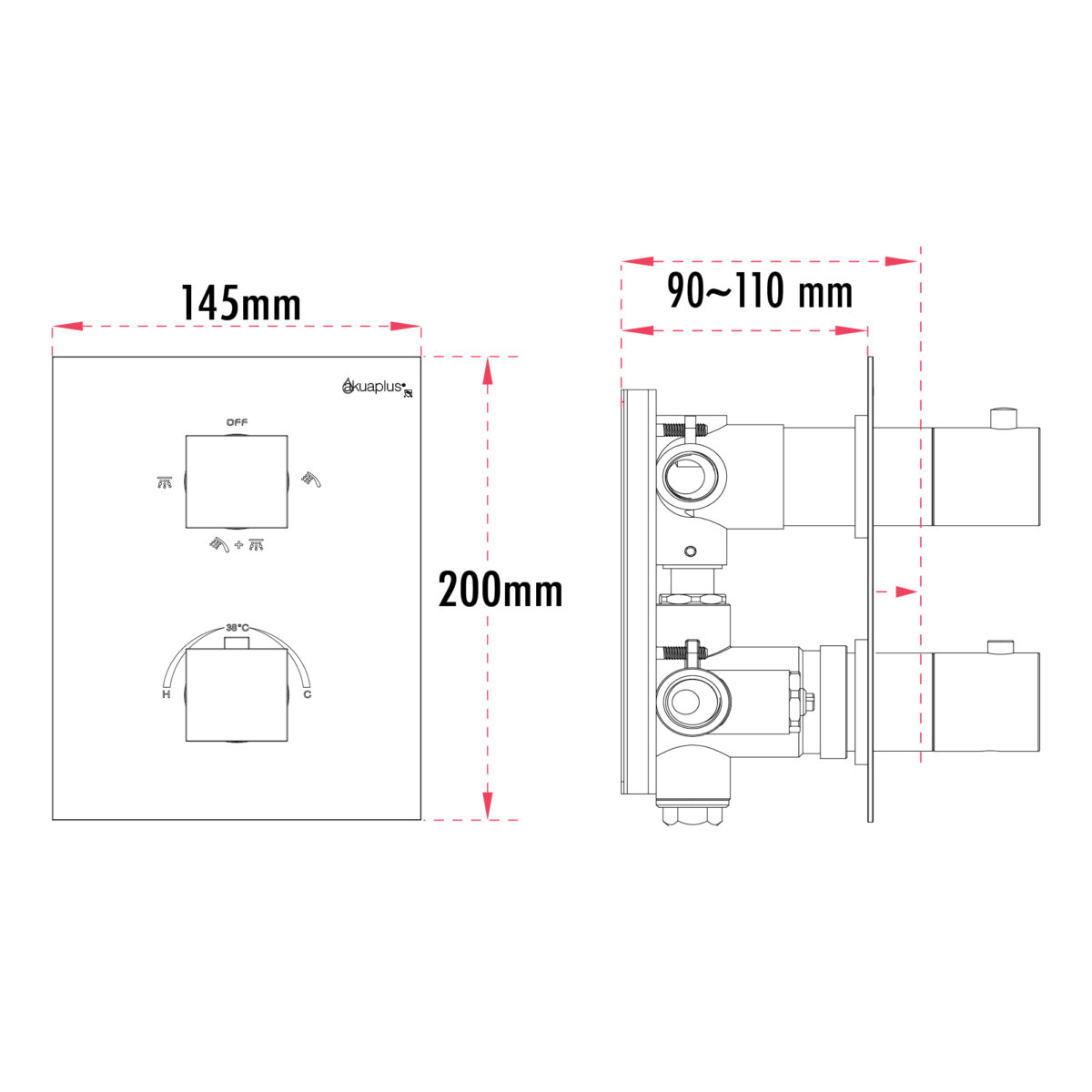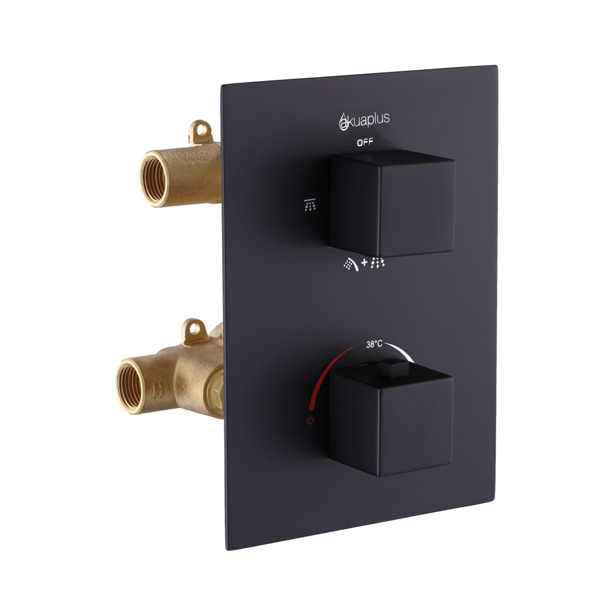 The ALI square thermostatic shower valve by akuaplus® is constructed from solid brass and designed to deliver precision, safety, and versatility for modern residential installations. It features two square control handles: – one square thermostatic handle for precise and safe temperature control; – one square 4-way diverter handle allowing selection of one outlet, another outlet, both simultaneously, or the off position. An integrated stop valve facilitates servicing and maintenance. The valve includes 1/2" threaded female connections, compatible with North American plumbing standards. The square trim plate measures 5 11/16" × 7 7/8" (14.5 × 20 cm) and is paired with matching square handles for a clean, architectural look. This valve is cUPC certified, ensuring compliance with applicable plumbing standards.