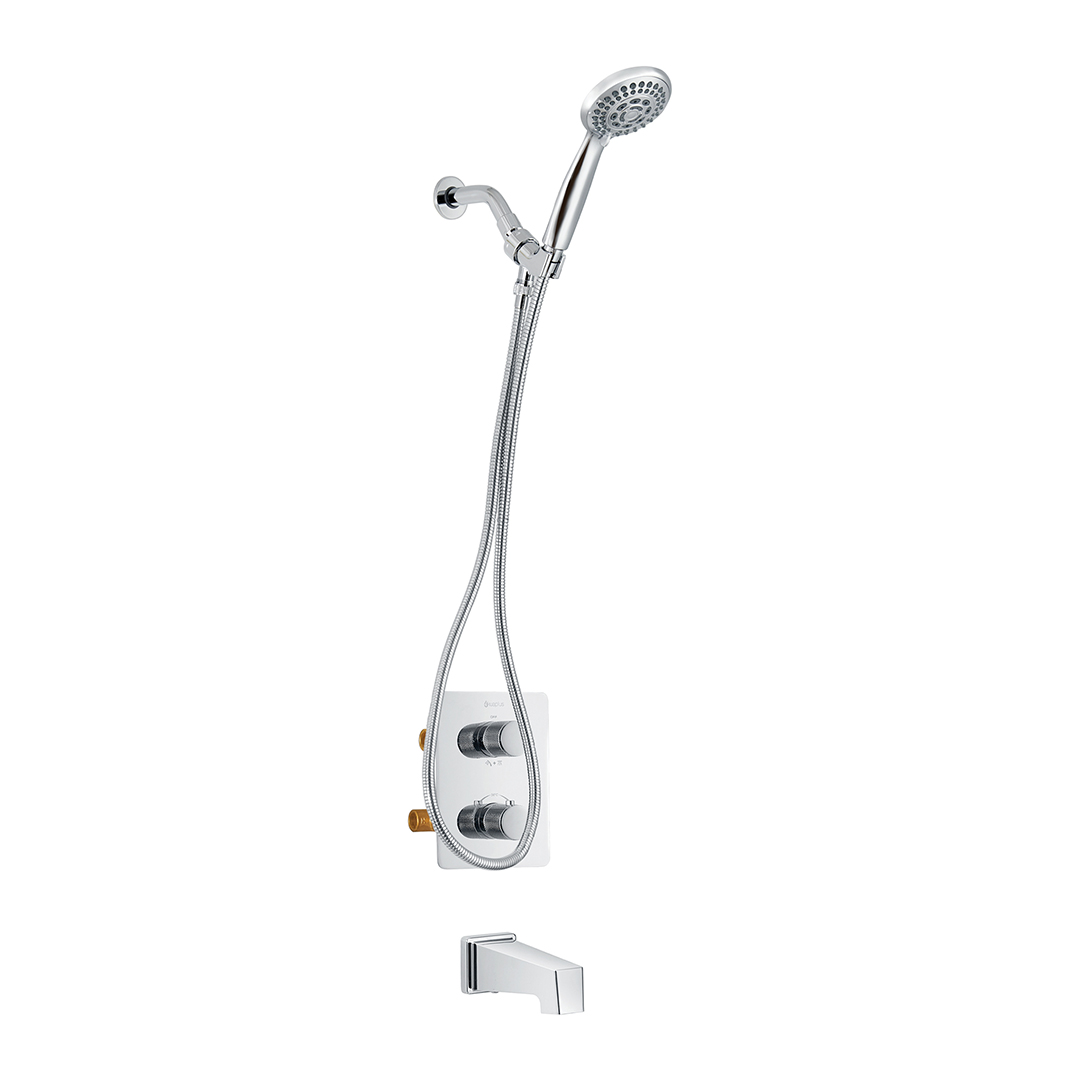 THERMOSTATIC BATH-SHOWER SET: Valve made of brass with thermostatic cartridge; 4-way diverter (handheld shower, bath spout, both simultaneously or off); 6-inch (15.24 cm) brass wall mount shower arm with ABS handheld shower bracket; 5-setting ABS handheld shower with easy-to-clean anti-limescale nozzles; Flexible and extendable 59-inch (1.5 m) double interlocking stainless steel hose with brass fittings; Slip-on 5-1/4 inches (13.3 cm) bath spout made of zinc; Flow rate of 9.5 L/min (2.5 US gal/min).