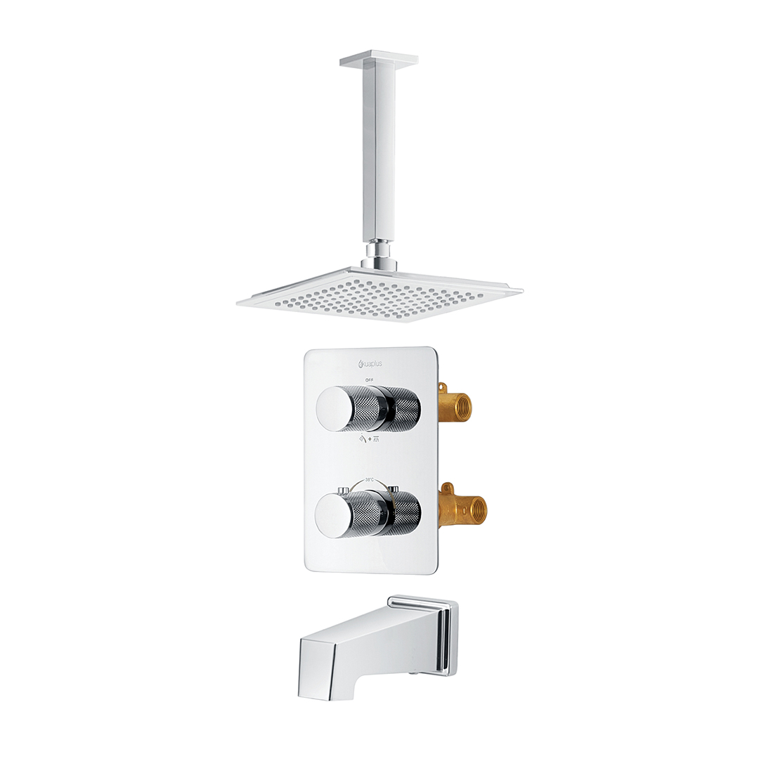 SQUARE THERMOSTATIC BATH-SHOWER SET: Valve made of brass with thermostatic cartridge; 4-way diverter (shower head, bath spout, both simultaneously or off); 8-inch (20.3 cm) ceiling mount brass shower arm; 9-inch (22.86 cm) ABS shower head, swivelling with brass ball joint; Easy-to-clean anti-limescale nozzles; Square slip-on bath spout, 5-1/4 inches (13.3 cm) made of zinc; Flow rate of 9.5 L/min (2.5 US gal/min).