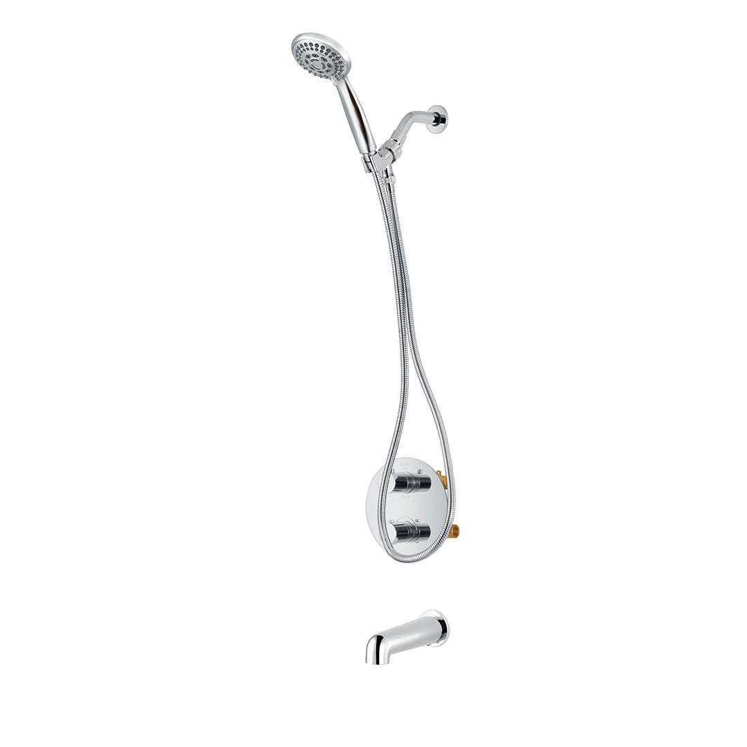 ROUND THERMOSTATIC SHOWER SET: Valve made of brass with thermostatic cartridge; 4-way diverter (handheld shower, bath spout, both simultaneously or off); 6-inch (15.24 cm) brass wall mount shower arm with ABS handheld shower bracket; 5-setting ABS handheld shower with easy-to-clean anti-limescale nozzles; Flexible 59-inch (1.5 m) double interlocking stainless steel hose with brass fittings; Slip-on bath spout, 7-1/2 inches (19 cm), made of zinc; Flow rate of 9.5 L/min (2.5 US gal/min).