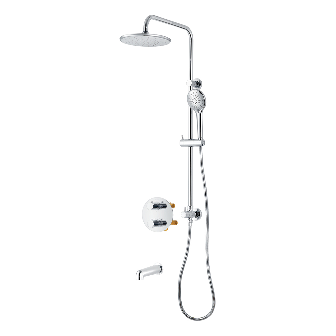 ROUND THERMOSTATIC BATH-SHOWER SET: Valve made of brass with thermostatic cartridge; 4-way diverter (shower system, bath spout, both simultaneously or off); Shower system on a brass shower post with adjustable shower bracket; 3-way diverter (shower head, handheld shower, or both simultaneously); 8-5/8 inches (22 cm) swiveling shower head; 3-setting handheld shower; Easy-to-clean anti-limescale nozzles; Flexible 59-inch (1.5 m) double interlocking stainless steel hose with brass fittings; Slip-on bath spout, 7-1/2 inches (19 cm), made of zinc; Flow rate of 9.5 L/min (2.5 US gal/min).
