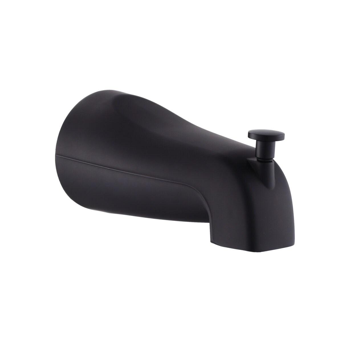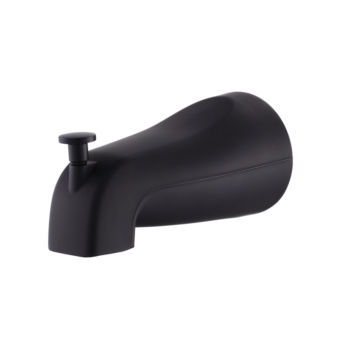 Round Bathtub spout with pull-up diverter in a matte black finish.