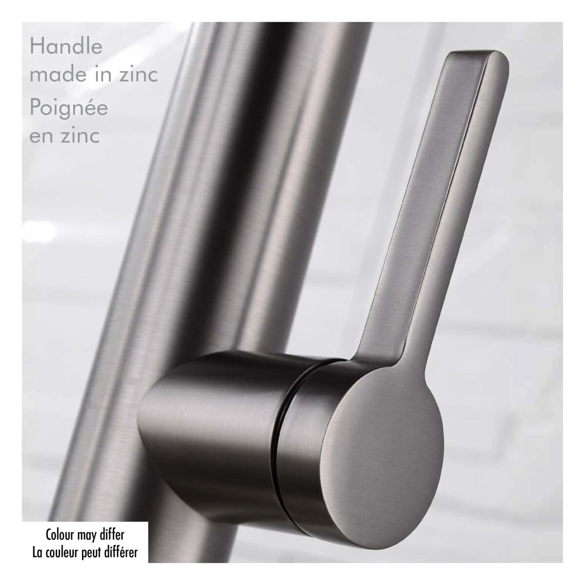 The akuaplus® CLARA single-hole magnetic kitchen faucet combines performance, durability, and modern design. It features a 2-function metal hand shower with smooth repositioning, secured by an integrated magnetic holder. Easy-to-clean anti-limescale nozzles help maintain optimal performance over time. The 360° swivel arm provides extended reach and flexibility, ideal for single or double-basin sinks. The faucet is equipped with a ceramic cartridge for durability and precise control. The single handle allows effortless adjustment of water flow and temperature. It includes a flexible TPV (thermoplastic vulcanizate) hose and a braided nylon water supply hose, ensuring reliable and long-lasting installation. Maximum flow rate: 6.81 L/min (1.8 US gal/min). Installation is quick and straightforward. The 3-hole deck plate is sold separately. Designed for residential applications, this faucet is cUPC certified, ensuring compliance with North American plumbing standards.