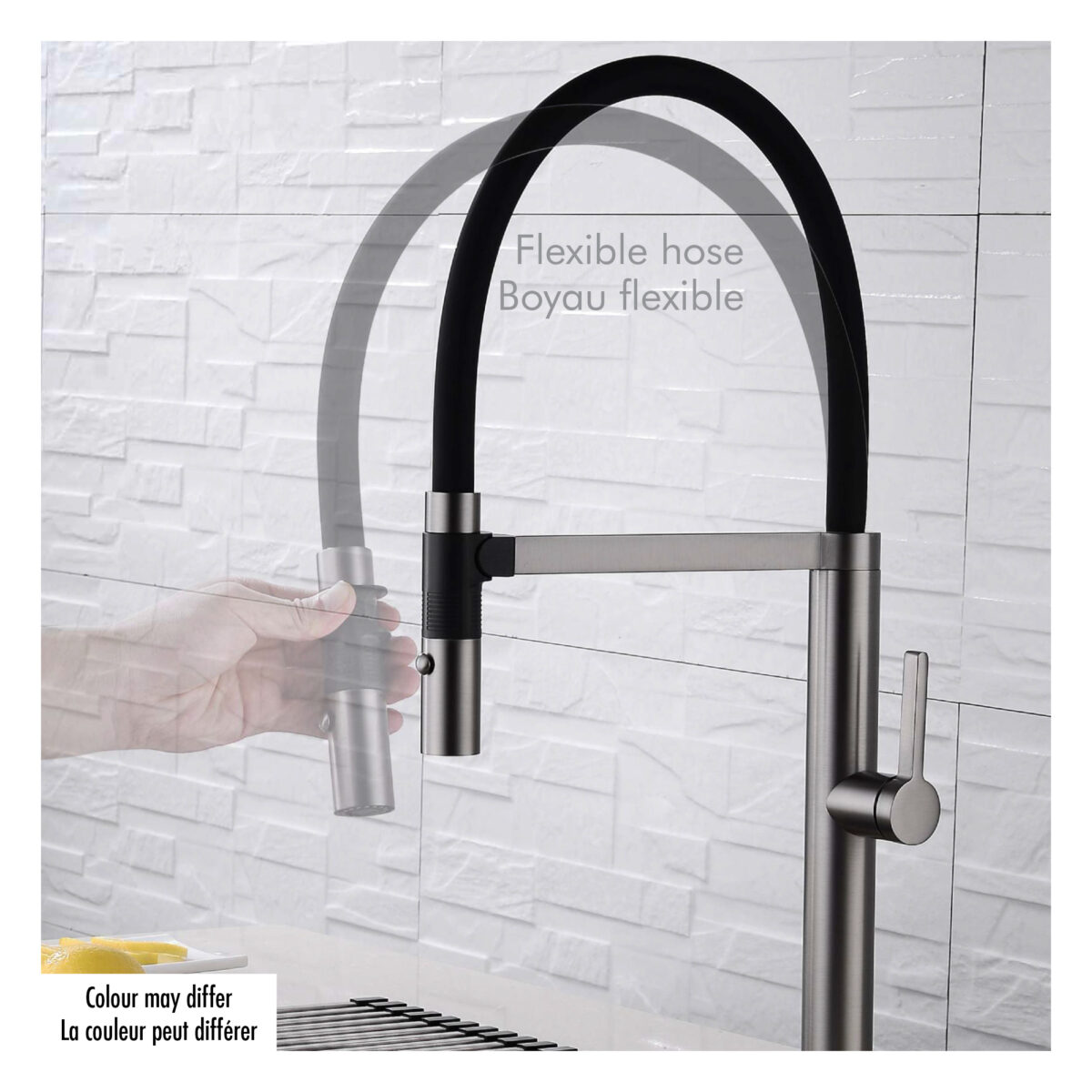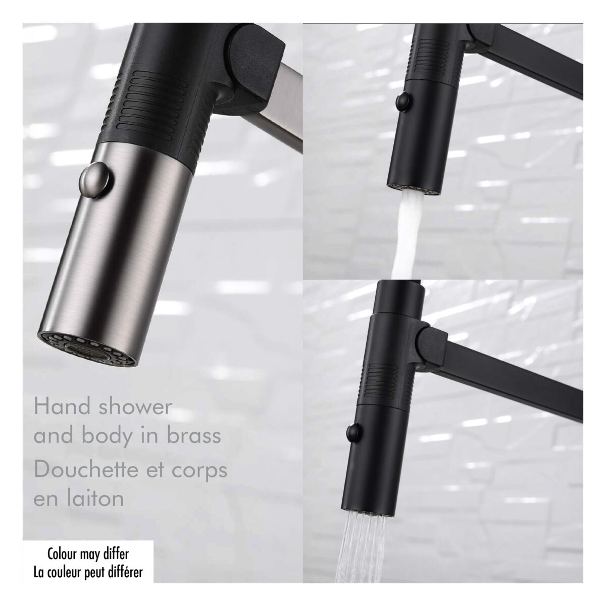 The akuaplus® CLARA single-hole magnetic kitchen faucet combines performance, durability, and modern design. It features a 2-function metal hand shower with smooth repositioning, secured by an integrated magnetic holder. Easy-to-clean anti-limescale nozzles help maintain optimal performance over time. The 360° swivel arm provides extended reach and flexibility, ideal for single or double-basin sinks. The faucet is equipped with a ceramic cartridge for durability and precise control. The single handle allows effortless adjustment of water flow and temperature. It includes a flexible TPV (thermoplastic vulcanizate) hose and a braided nylon water supply hose, ensuring reliable and long-lasting installation. Maximum flow rate: 6.81 L/min (1.8 US gal/min). Installation is quick and straightforward. The 3-hole deck plate is sold separately. Designed for residential applications, this faucet is cUPC certified, ensuring compliance with North American plumbing standards.