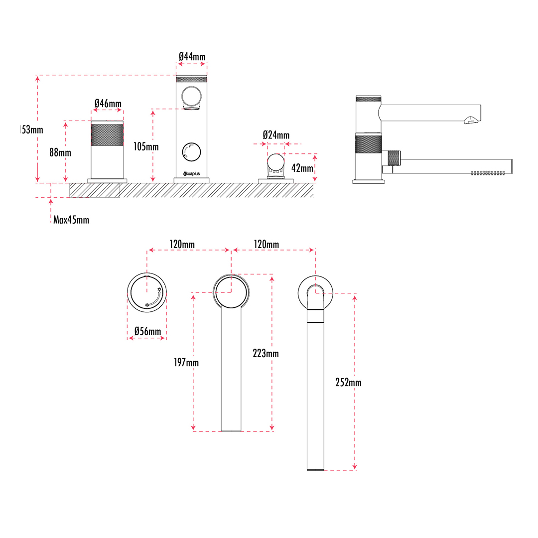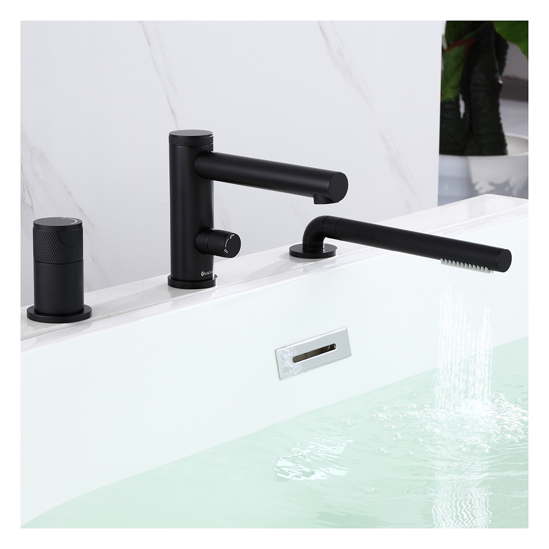 BATHTUB FAUCET: Made of brass; 3-piece for Roman bathtub; Single handle; Ceramic cartridge; Hand shower with 90° connection, Easy-to-clean anti-limescale nozzles, check valve and flow rate of 9.5 L/min (2.5 US gal/min); Bathtub spout water flow of 20 L/min (5.28 US gal/min); Water supply lines included.