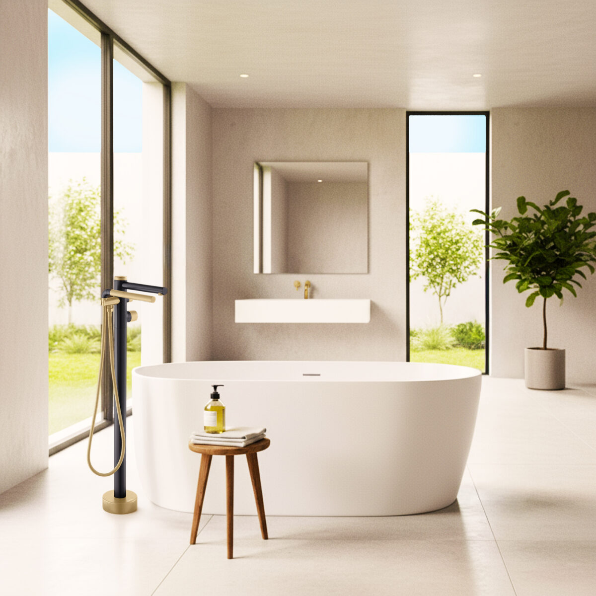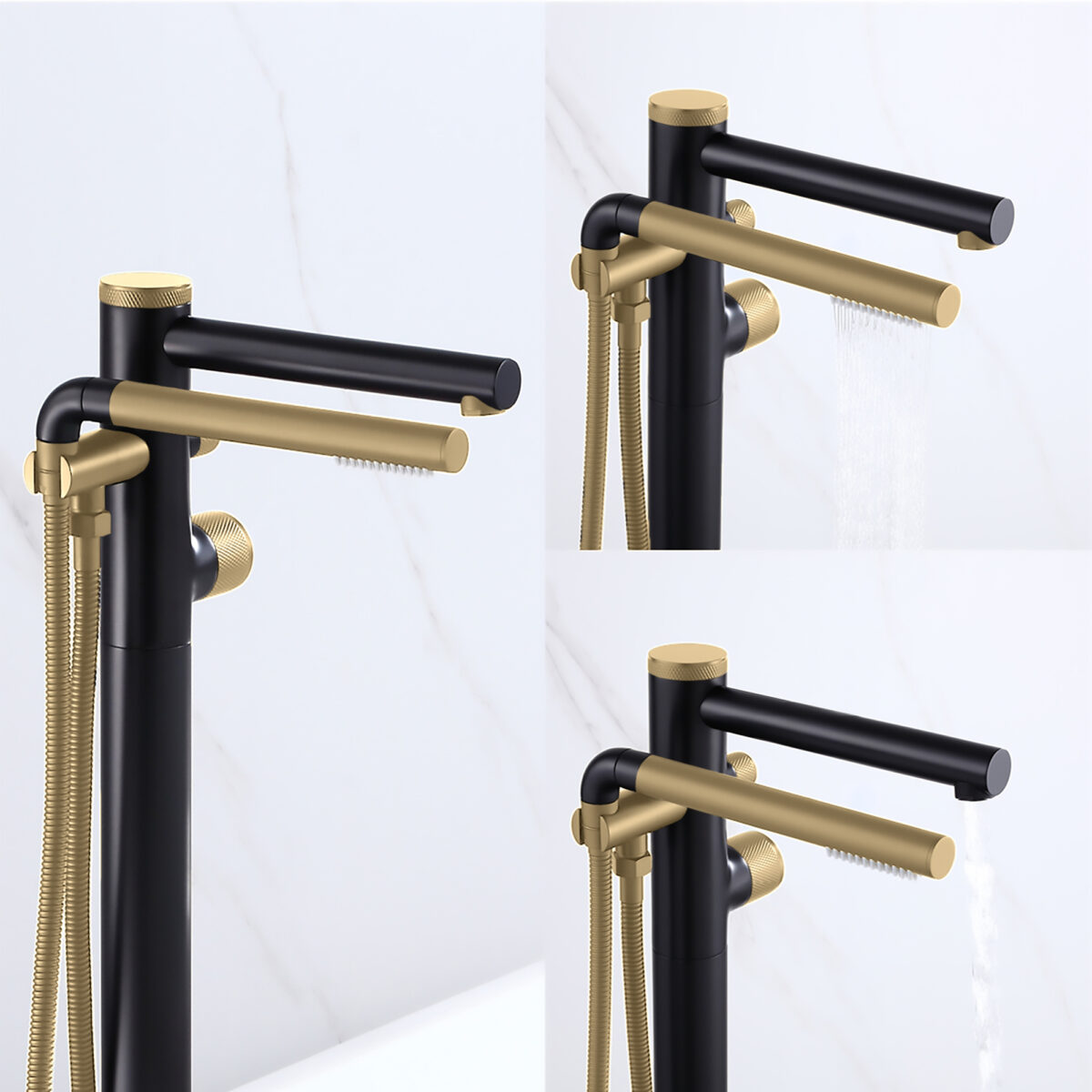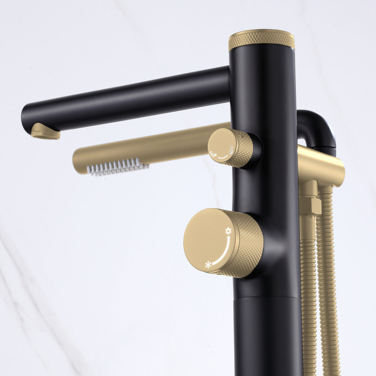 Freestanding bathtub faucet with handheld shower in a matte black and brushed champagne gold finish. Brass body, ceramic cartridge, 2-way diverter.