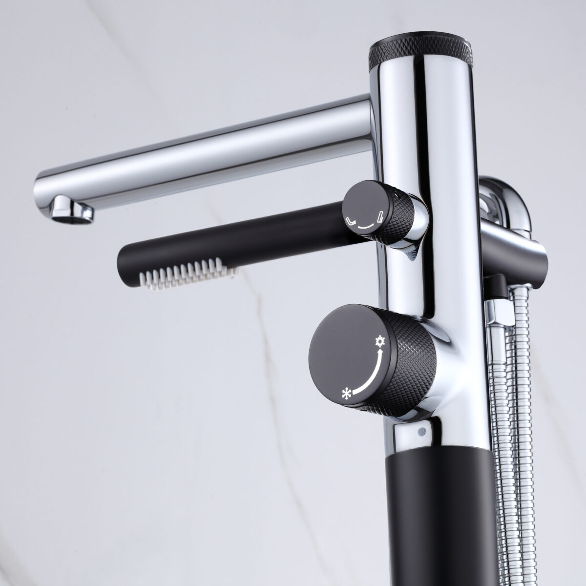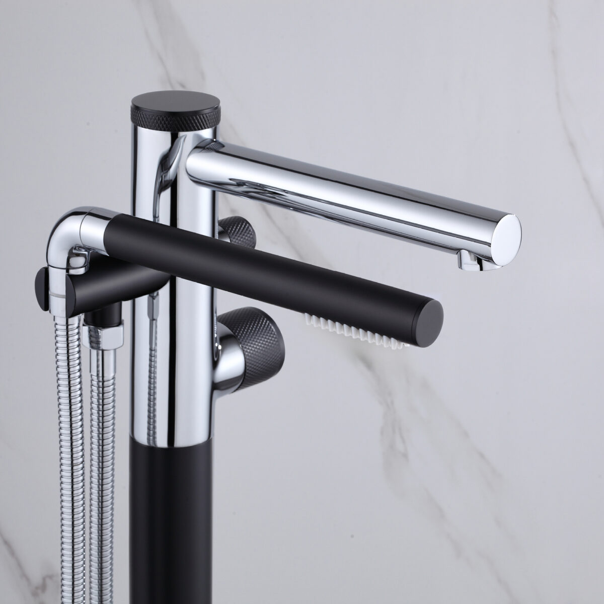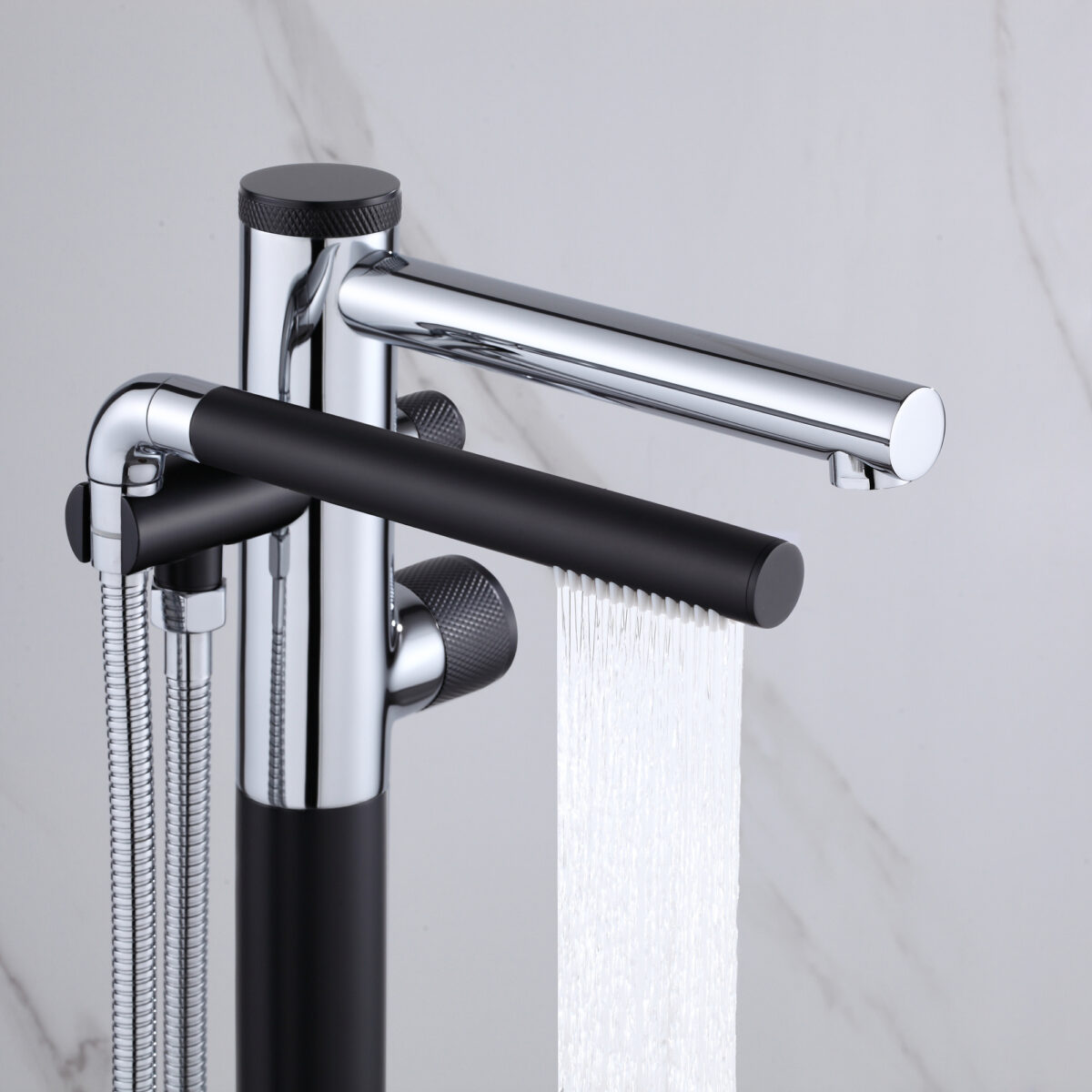 Freestanding bathtub faucet with handheld shower in a chrome and matte black finish. Brass body, ceramic cartridge, 2-way diverter.