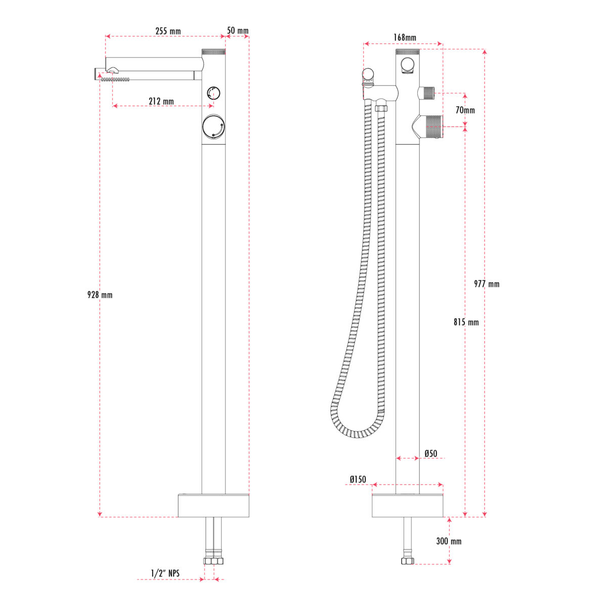 The CLAUDIA floor-mount bathtub faucet with hand shower by AKUALUX® is constructed from durable brass, providing strength, reliability, and corrosion resistance for modern residential installations. It features a ceramic cartridge that ensures precise and long-lasting control of water flow and temperature. The 2-way diverter allows easy switching between the bathtub spout and hand shower depending on the user’s needs. The single-setting hand shower includes easy-to-clean anti-limescale nozzles and is connected to a 59" (1.5 m) double-interlocked stainless steel hose with brass fittings, ensuring durability and performance. The hand shower delivers a flow rate of 9.5 L/min (2.5 US gal/min), while the bathtub spout provides a flow rate of 20 L/min (5.28 US gal/min) for fast tub filling. The faucet includes water supply lines with 1/2" threaded connections, ensuring reliable installation and compatibility with North American plumbing standards. With an overall height of 38 15/32" (97.7 cm), this floor-mount faucet offers a refined and contemporary appearance. Designed for residential applications, it is cUPC certified, ensuring compliance with North American plumbing standards.