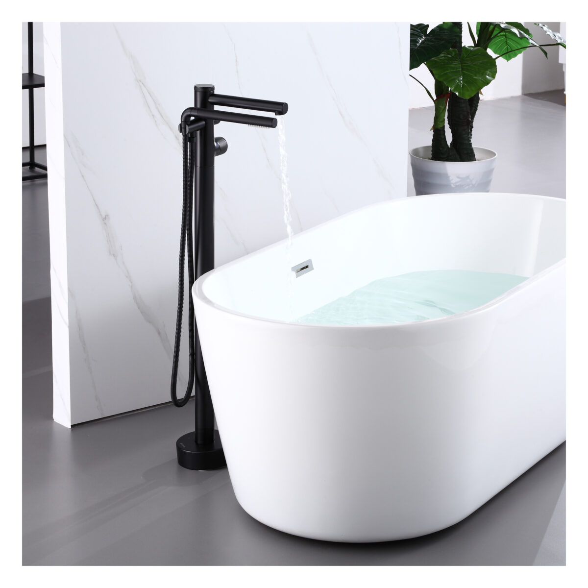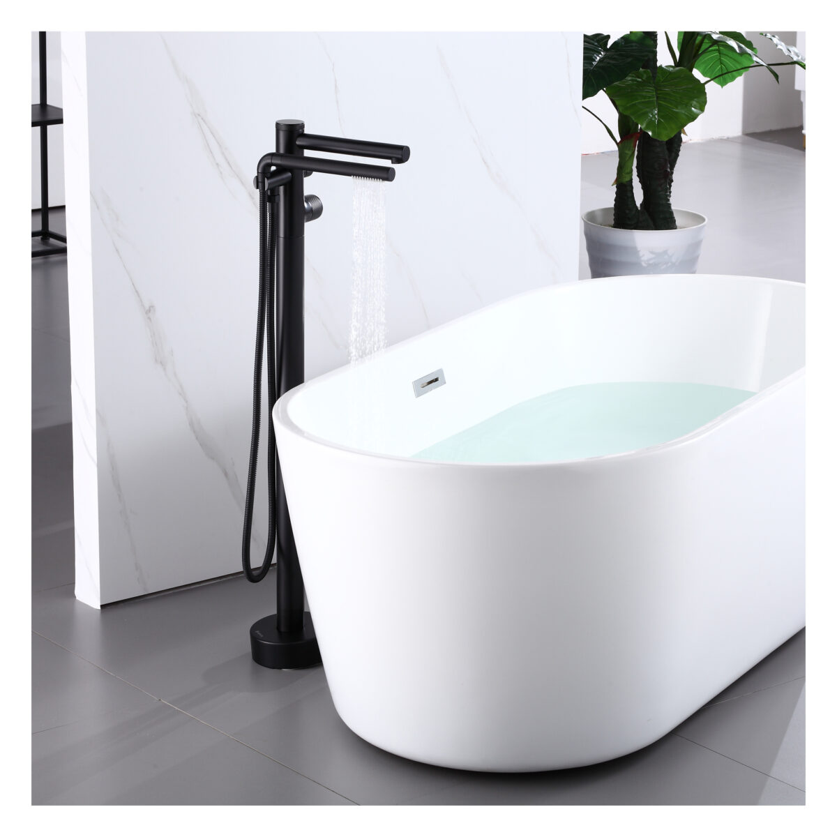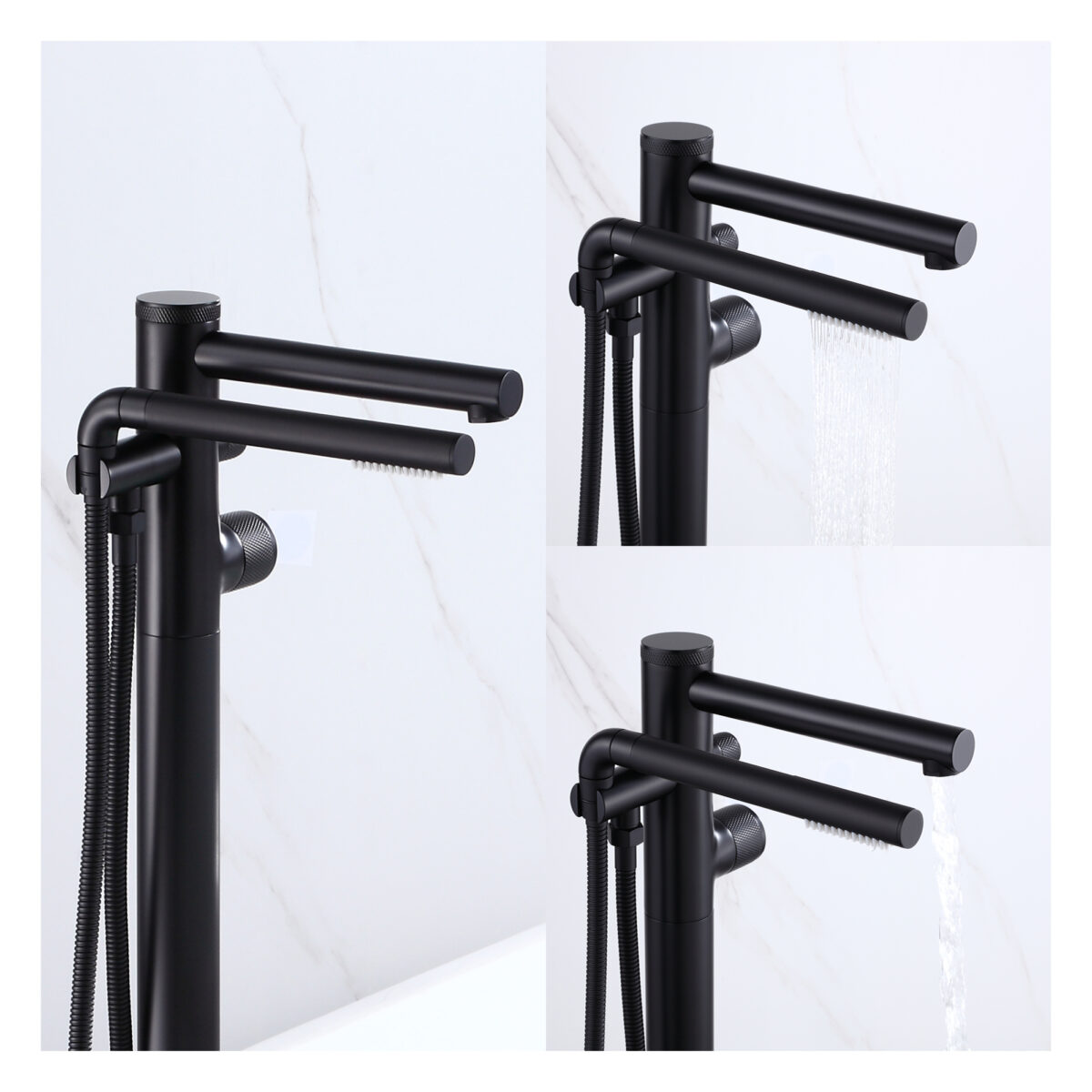 Freestanding bathtub faucet with handheld shower in a matte black finish. Brass body, ceramic cartridge, 2-way diverter.