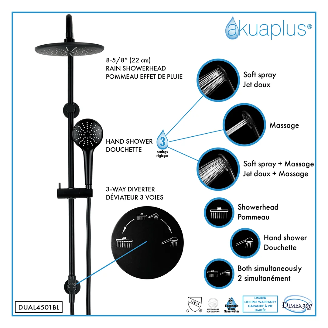 The akuaplus® DUAL4501BL 3-way shower system in matte black delivers a contemporary look with dual functionality. It features a sleek 8-5/8 inches (22 cm) rain shower head and a 3-setting handheld shower for a customized shower experience. The system includes a 59-inch flexible PVC hose, corrosion-resistant brass fittings, and a durable matte black finish that complements modern bathrooms. Perfect for those seeking both style and versatility in their shower system. Replace your existing shower head with this modern combo.