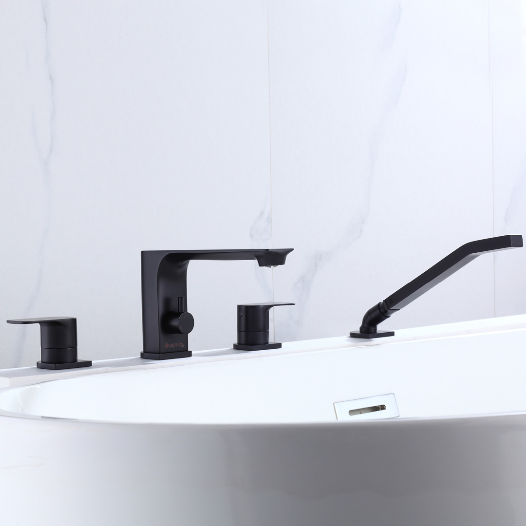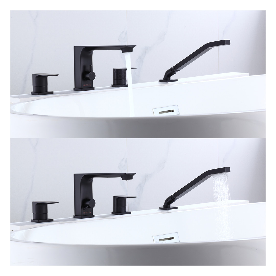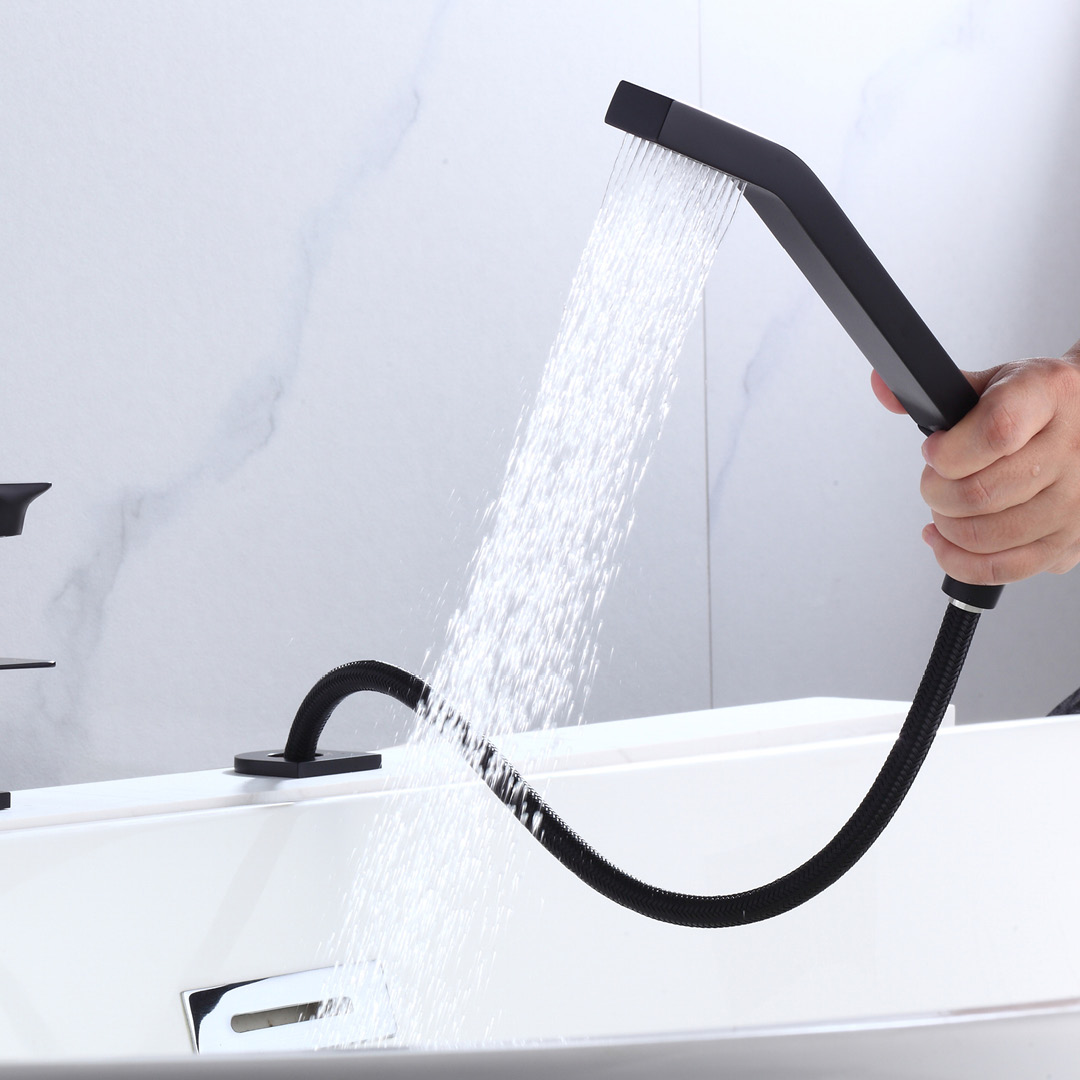 4-piece round roman Bathtub faucet with handheld Shower in a matte black finish.