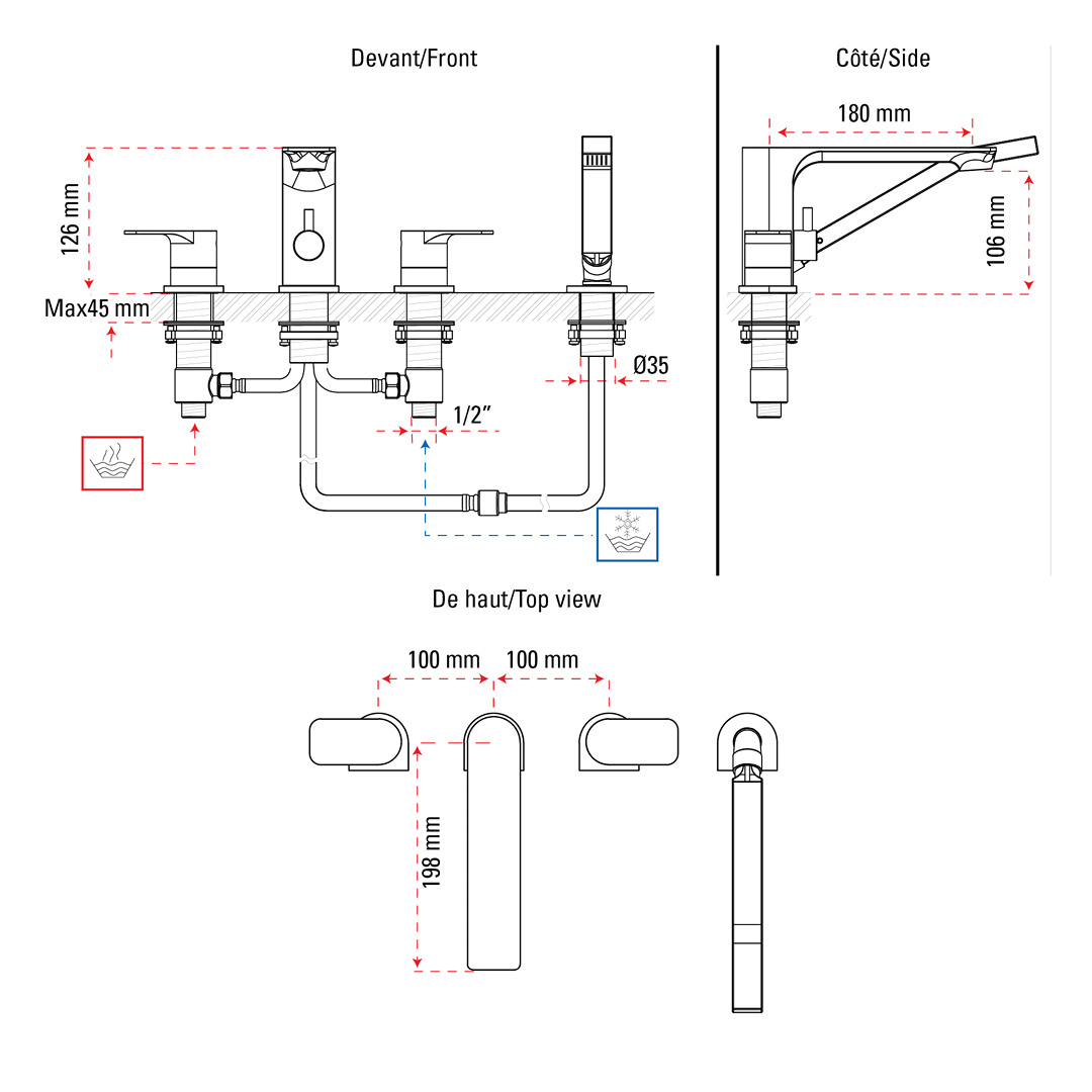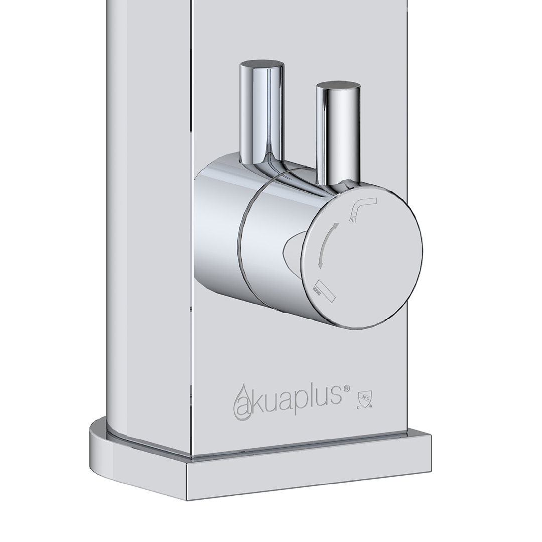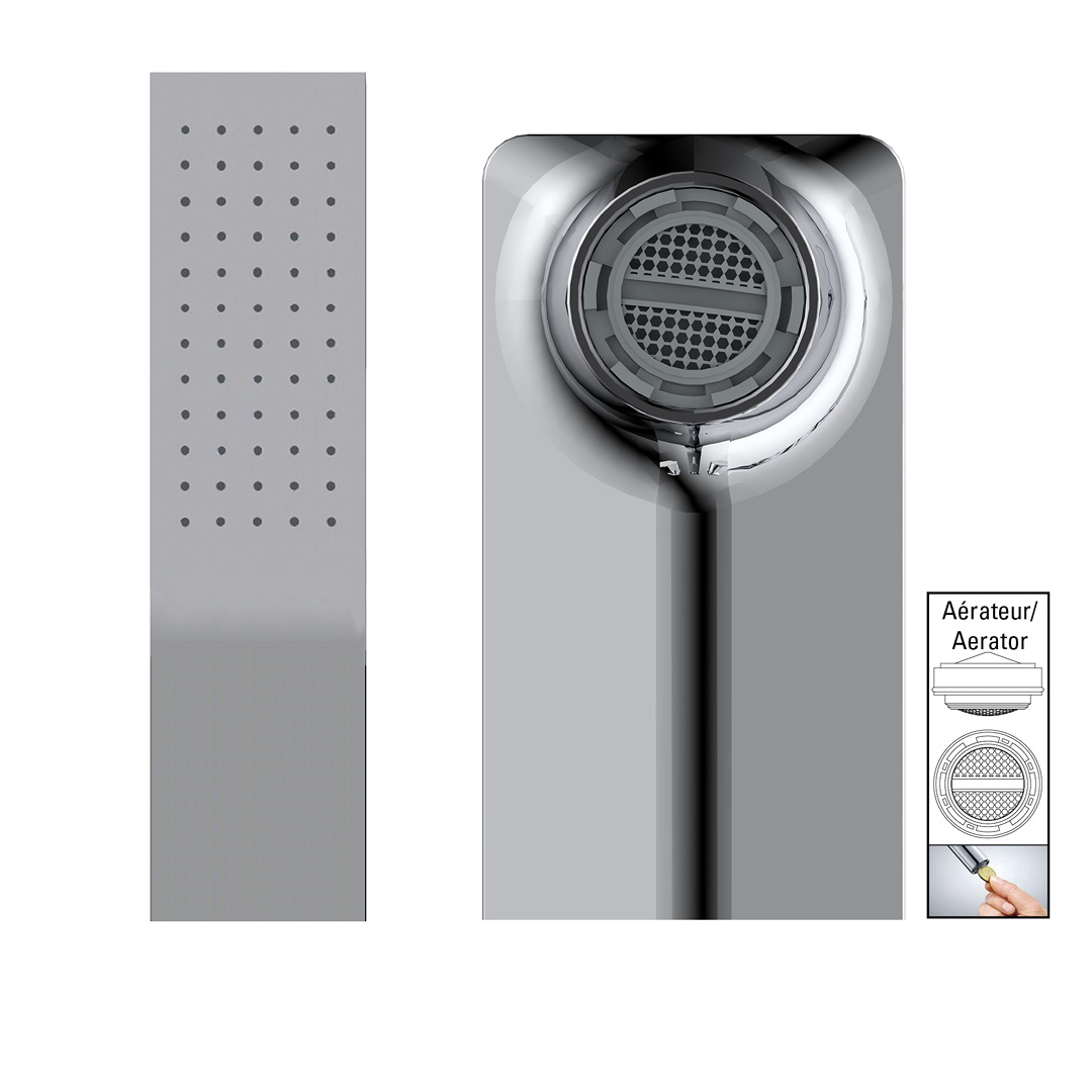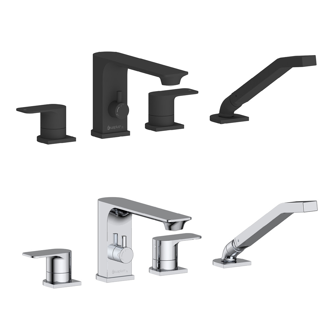 BATHTUB FAUCET: Made of brass; 4-piece for Roman bathtub; 2 handles; Ceramic cartridge; Hand shower with 45° connection, check valve and Flow rate of 9.5 L/min (2.5 US gal/min); Bathtub spout water flow of 20 L/min (5.28 US gal/min); Water supply lines included.