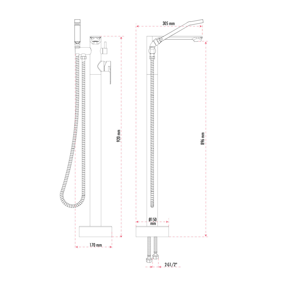 The ELENA floor-mount bathtub faucet with hand shower by AKUALUX® is designed for freestanding bathtubs and modern residential installations. Constructed from durable brass and measuring 36 1/4" (92 cm) in height, it features a ceramic cartridge that ensures precise and reliable control of water flow and temperature, along with a 2-way diverter for easy switching between the bathtub spout and hand shower. The single-setting hand shower, equipped with a 45° connection and a non-return valve, delivers a flow rate of 9.5 L/min (2.5 US gal/min) in compliance with water-efficiency standards. The bathtub spout provides a high flow rate of 20 L/min (5.28 US gal/min), allowing fast and efficient bathtub filling. The faucet includes a 59" (1.5 m) double-interlocking stainless steel flexible hose with brass fittings, ensuring durability and long-term reliability. Designed for floor-mount installation, this model is cUPC certified, ensuring compliance with North American plumbing standards.