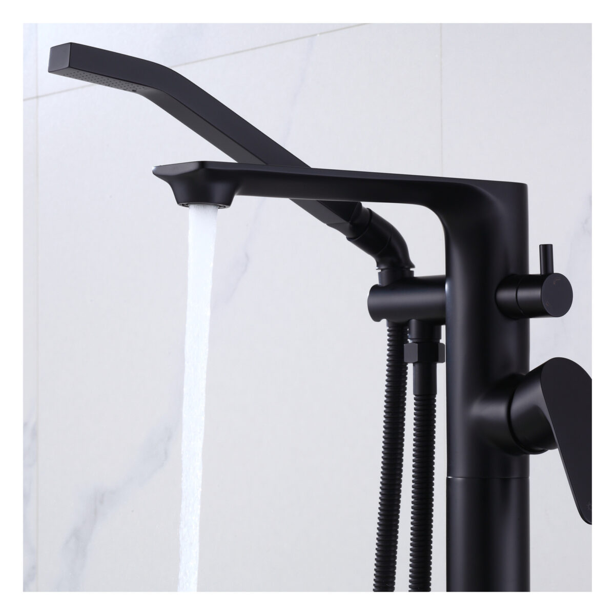 Freestanding bathtub faucet with handheld shower in a matte black finish. Brass body, ceramic cartridge, 2-way diverter.