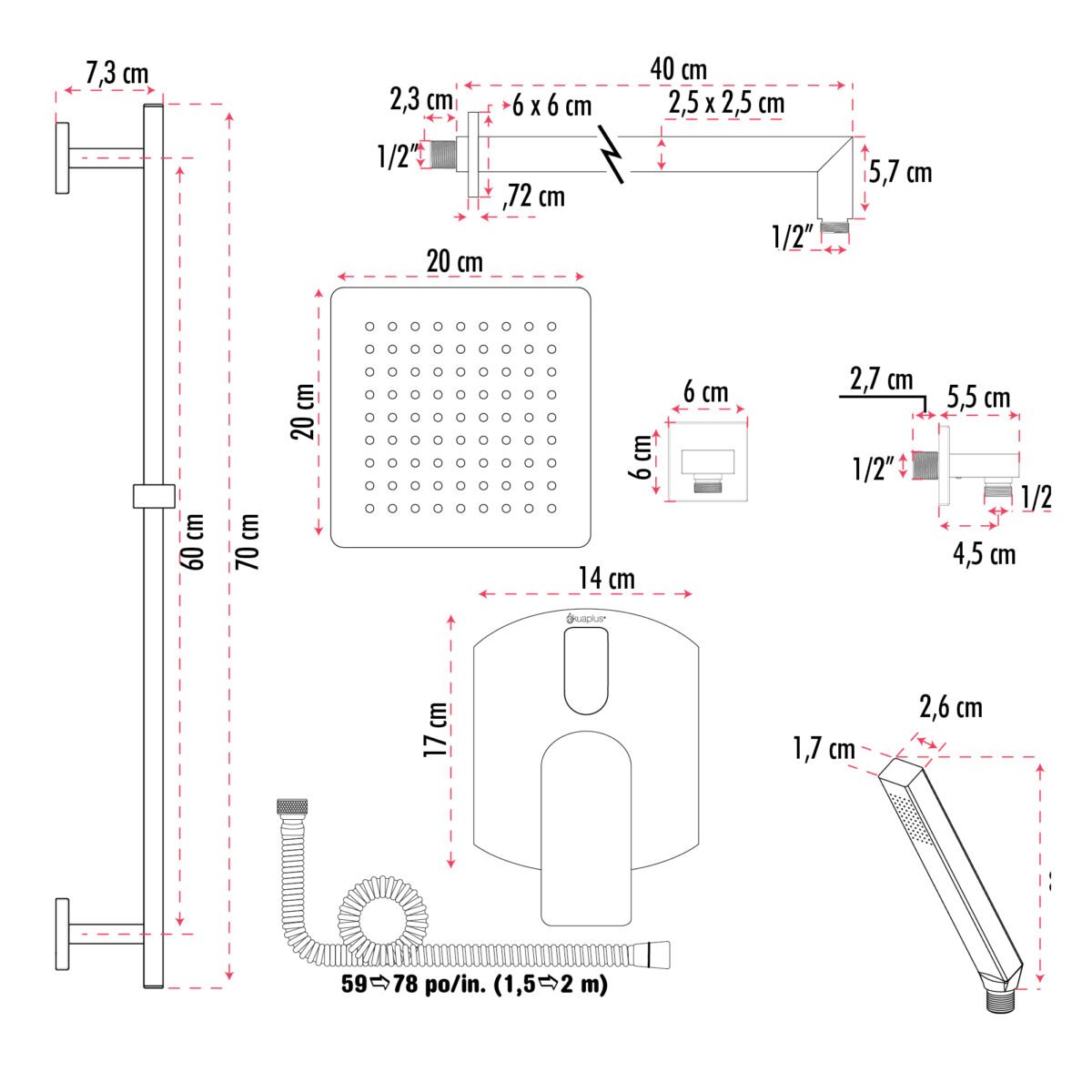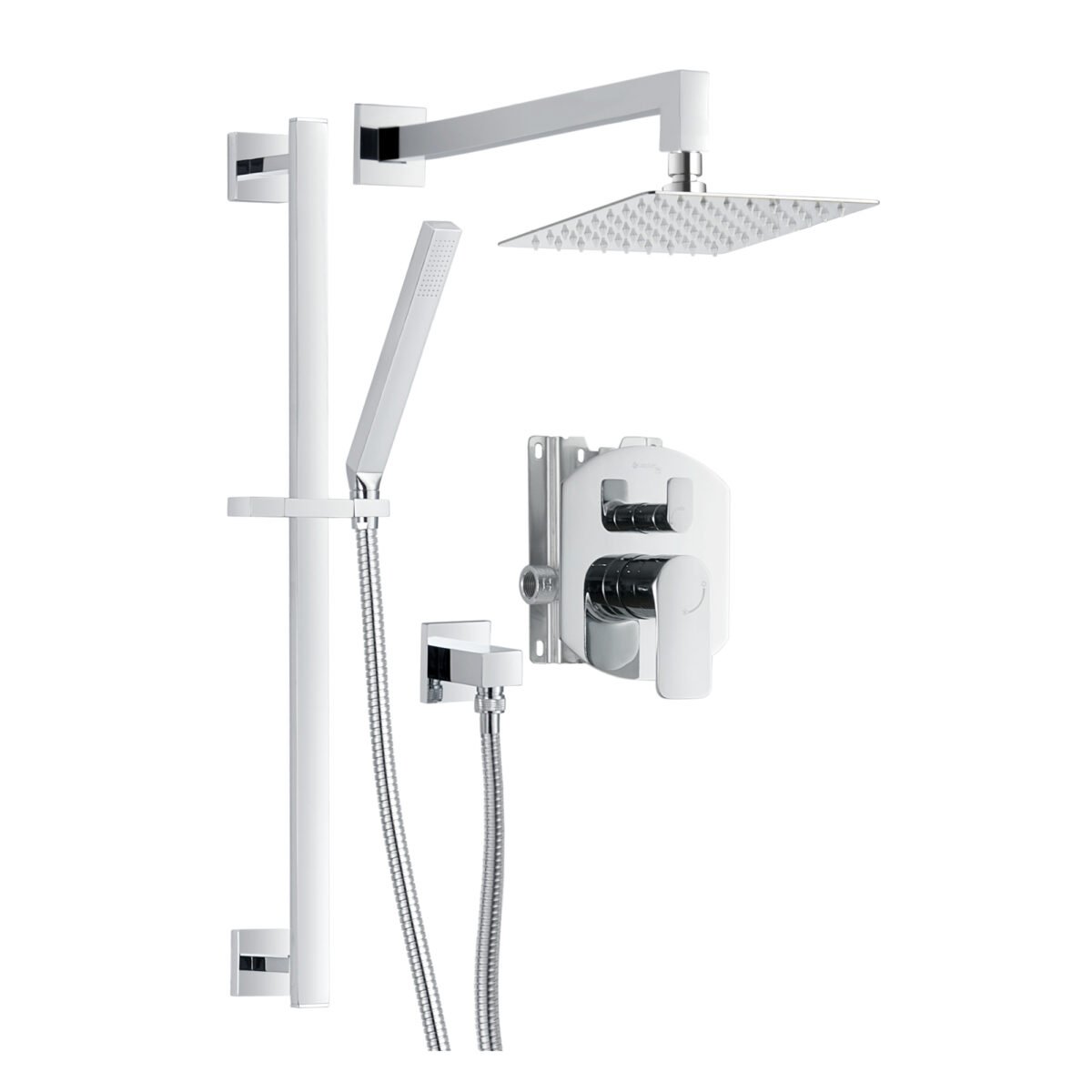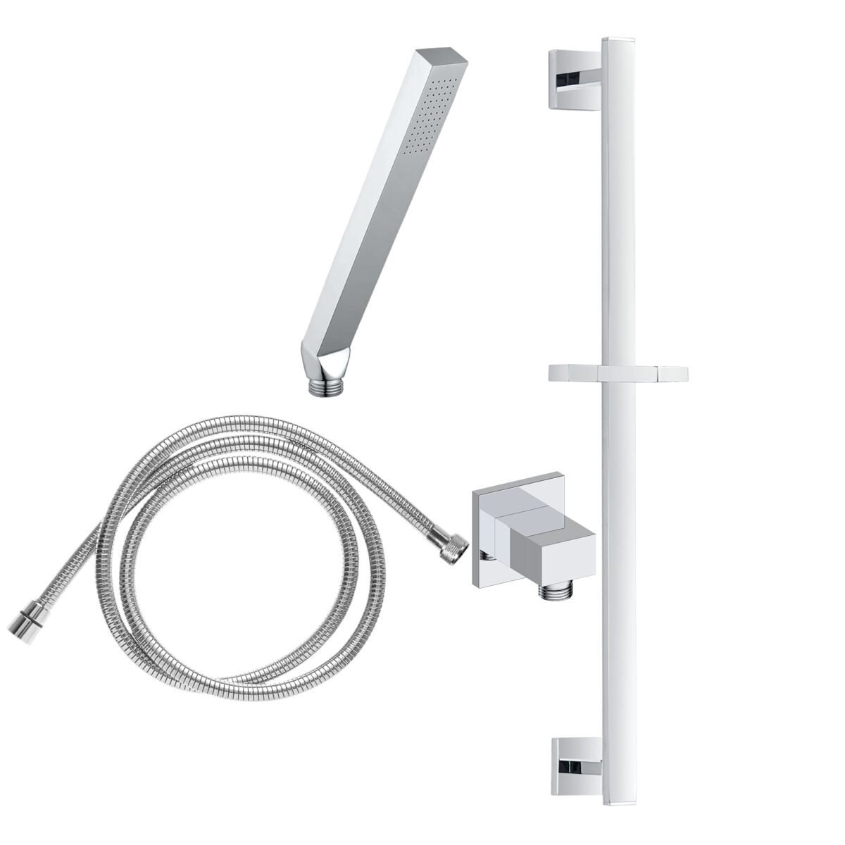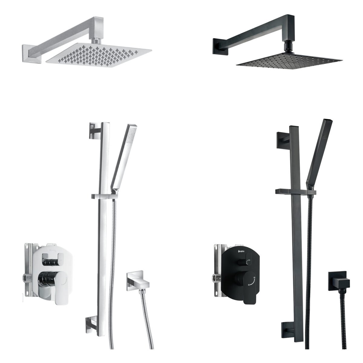 The ELENA akuaplus® pressure balance shower set is designed to deliver performance, versatility, and durability for modern residential bathroom installations. Made of brass and stainless steel, the set includes a brass shower valve equipped with a pressure balance cartridge that maintains consistent water temperature while minimizing sudden pressure fluctuations. The 3-way diverter allows use of the showerhead, the hand shower, or both simultaneously. The valve includes an integrated shut-off valve and 1/2" female threaded connections compatible with standard plumbing installations. The set features a 15 3/4" (40 cm) wall mount shower arm with flange for secure installation. The 8" (20 cm) swiveling showerhead includes easy-to-clean anti-limescale nozzles for simplified maintenance. The 1-setting hand shower provides straightforward functionality. A 26" (66 cm) shower post with adjustable hand shower holder ensures ergonomic flexibility. The 59" (1.5 m) double interlocking stainless steel hose with brass fittings provides durability and corrosion resistance. A brass elbow fitting (male/male, 1/2") is included to complete the installation. Maximum flow rate is 9.5 L/min (2.5 US gal/min). A bathtub spout is available as an option: SP7726BL or SP7726CP. Designed for residential applications, this set is cUPC certified, ensuring compliance with North American plumbing standards.