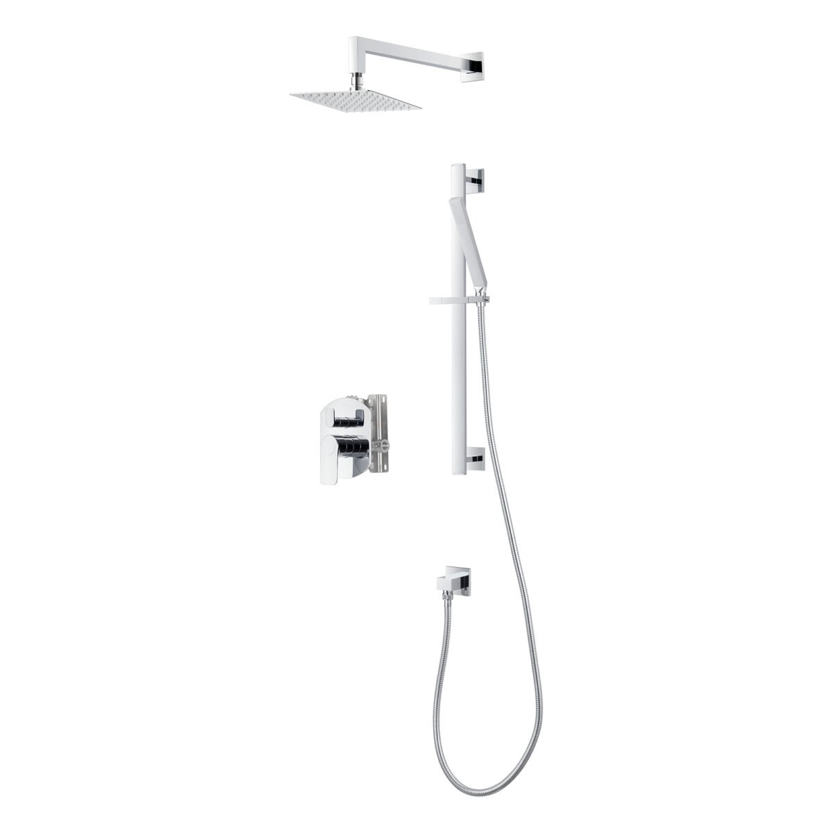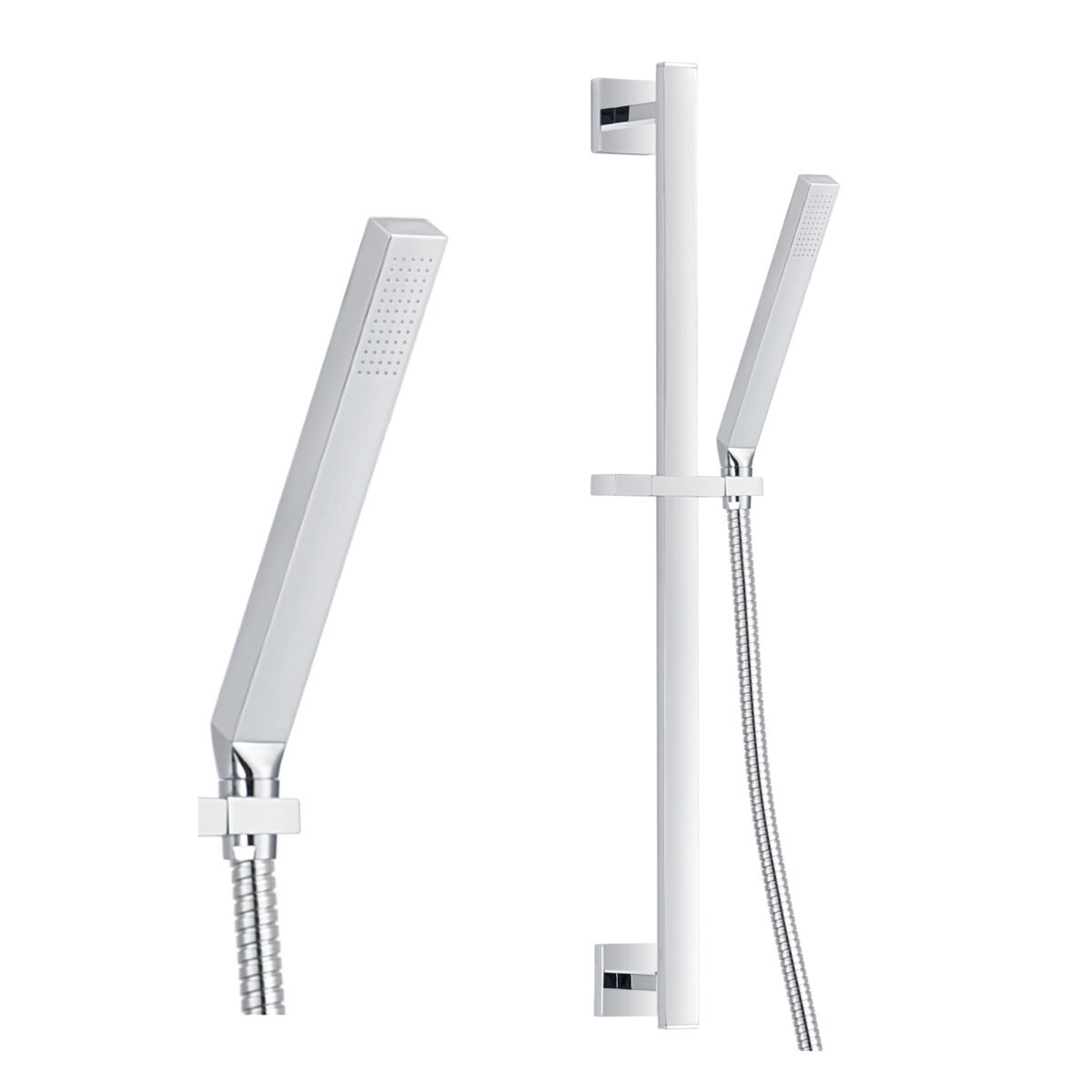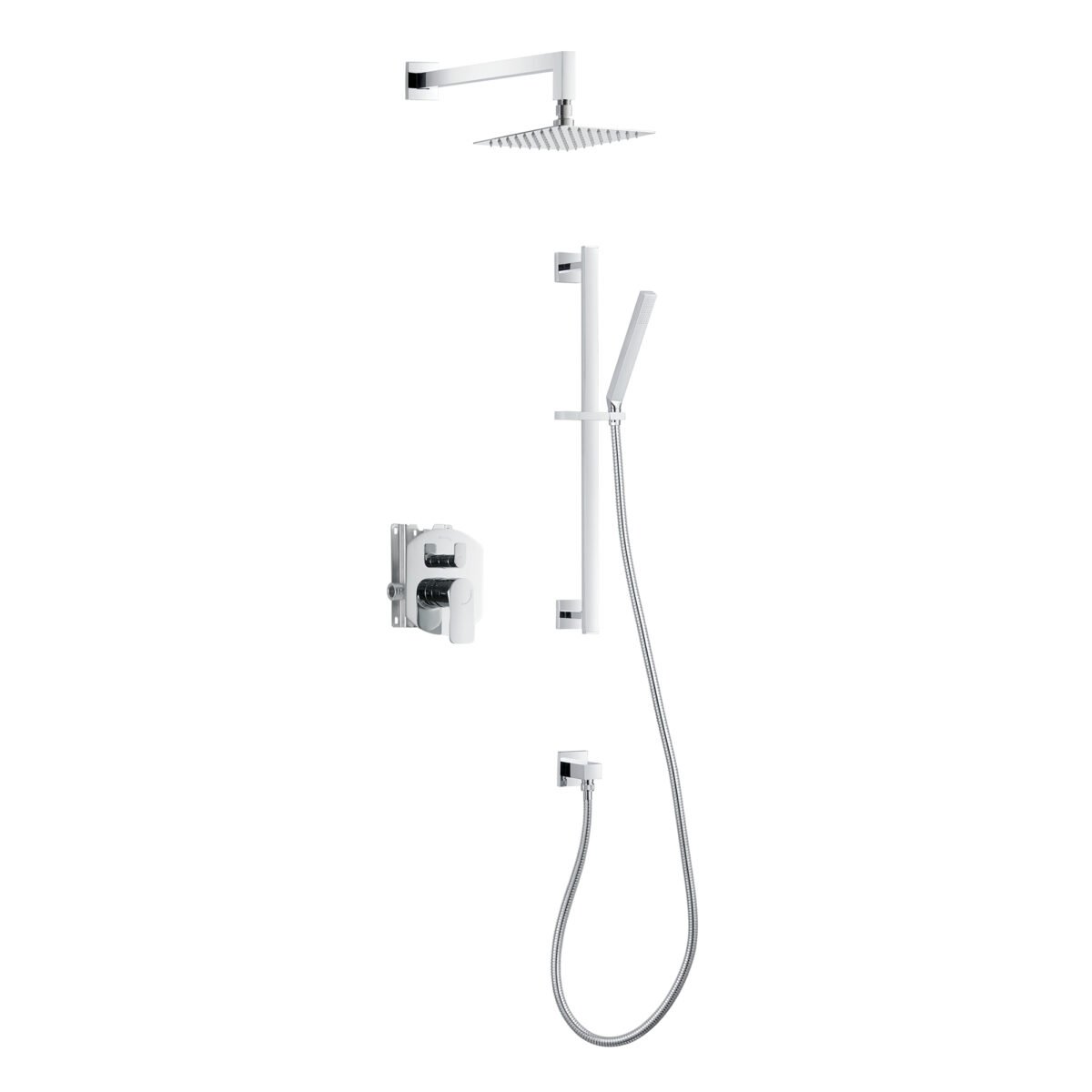 The ELENA akuaplus® pressure balance shower set is designed to deliver performance, versatility, and durability for modern residential bathroom installations. Made of brass and stainless steel, the set includes a brass shower valve equipped with a pressure balance cartridge that maintains consistent water temperature while minimizing sudden pressure fluctuations. The 3-way diverter allows use of the showerhead, the hand shower, or both simultaneously. The valve includes an integrated shut-off valve and 1/2" female threaded connections compatible with standard plumbing installations. The set features a 15 3/4" (40 cm) wall mount shower arm with flange for secure installation. The 8" (20 cm) swiveling showerhead includes easy-to-clean anti-limescale nozzles for simplified maintenance. The 1-setting hand shower provides straightforward functionality. A 26" (66 cm) shower post with adjustable hand shower holder ensures ergonomic flexibility. The 59" (1.5 m) double interlocking stainless steel hose with brass fittings provides durability and corrosion resistance. A brass elbow fitting (male/male, 1/2") is included to complete the installation. Maximum flow rate is 9.5 L/min (2.5 US gal/min). A bathtub spout is available as an option: SP7726BL or SP7726CP. Designed for residential applications, this set is cUPC certified, ensuring compliance with North American plumbing standards.