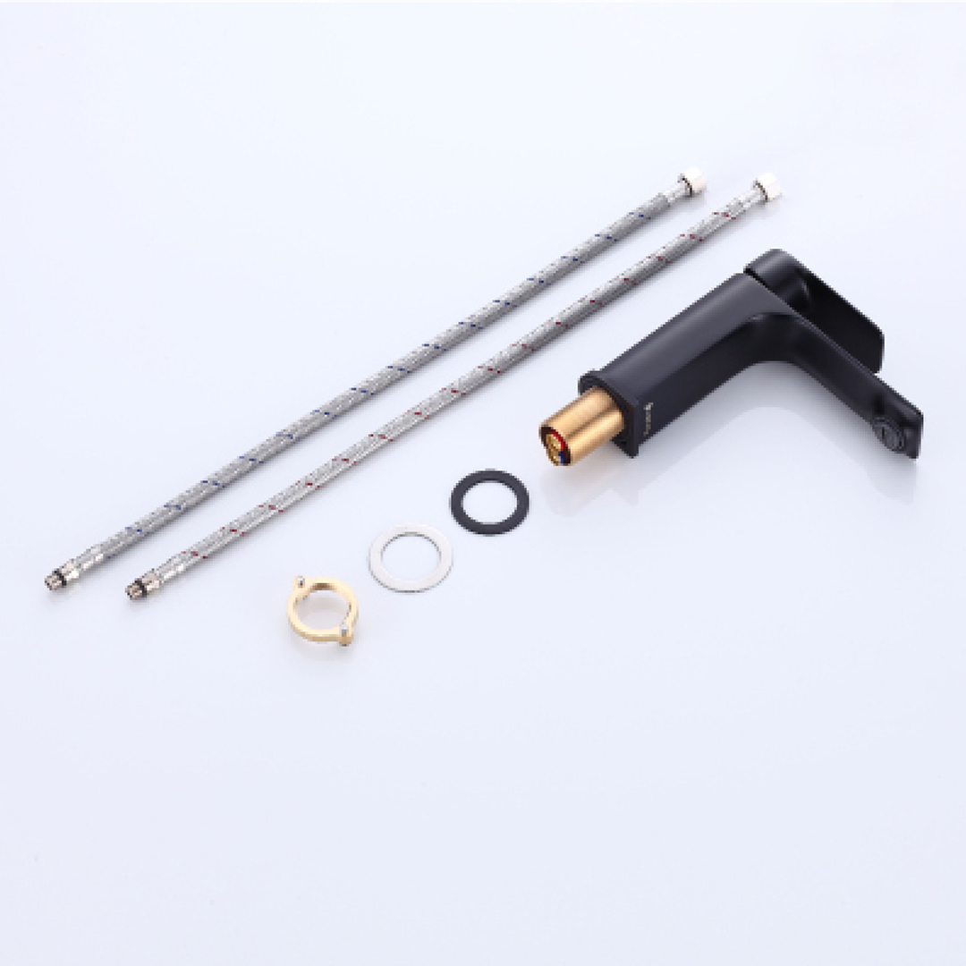 SINGLE-HOLE LAVATORY FAUCET: Made of brass; Ceramic cartridge; Flow of 6.81 L/min (1.8 US gal/min); Water supply lines included; Pop-up drain and deck plate sold separately.