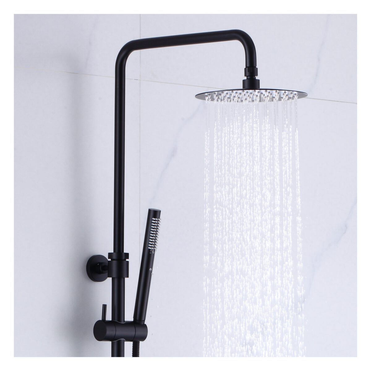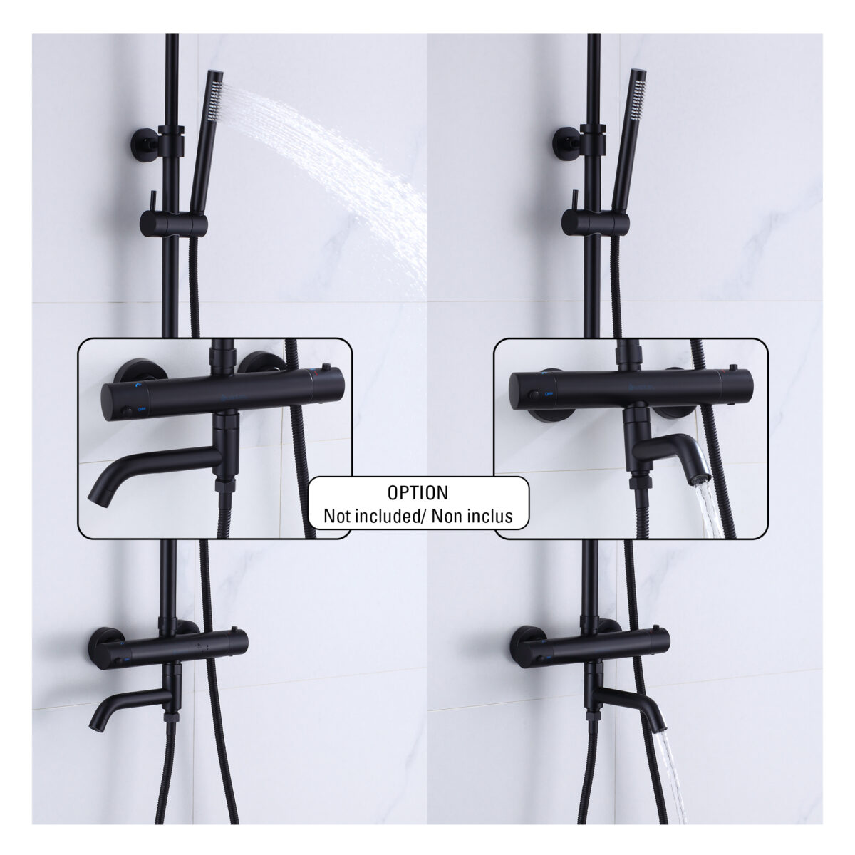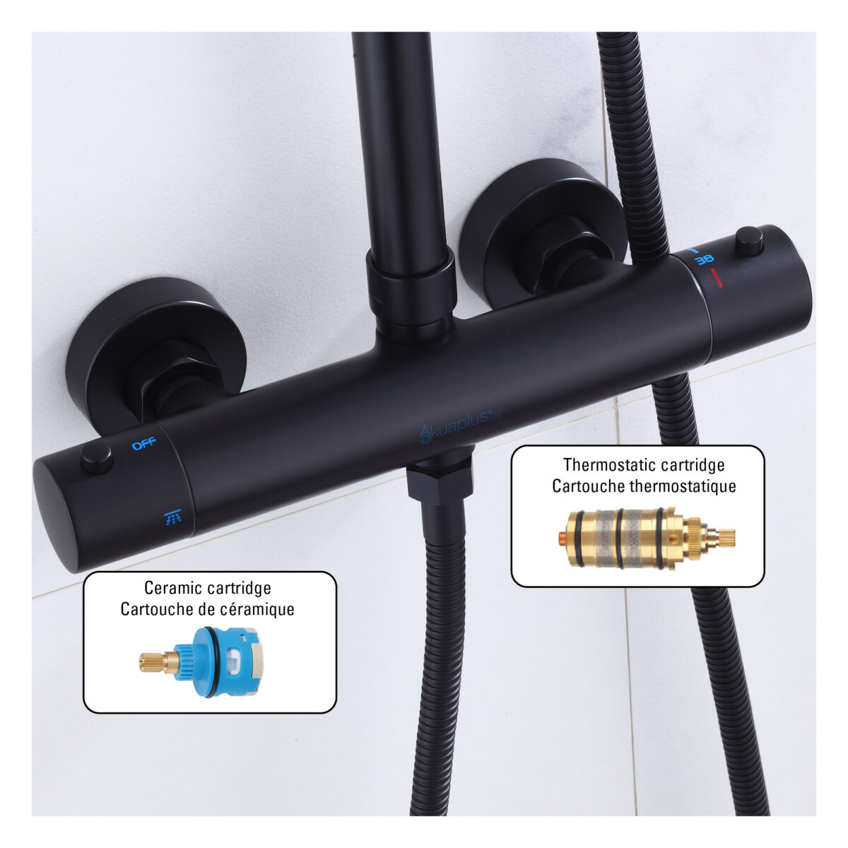 The ELITE round 4-way thermostatic shower column by akuaplus® is designed to deliver performance, reliability, and versatility for modern residential bathrooms. Constructed from brass and stainless steel, it features a solid brass valve with a thermostatic cartridge that maintains consistent and safe water temperature. The 4-way diverter allows operation of the showerhead, the hand shower, both simultaneously, or complete shut-off depending on user preference. The 8” (20 cm) round swiveling showerhead provides even water coverage, while the 1-setting hand shower offers straightforward functionality. Easy-to-clean anti-limescale nozzles simplify maintenance. The set includes a 59” (1.5 m) double interlocking stainless steel flexible hose with brass fittings, an adjustable hand shower holder, and wall mounting brackets. The flow rate is limited to 9.5 L/min (2.5 US gal/min). Overall dimensions are 10 5/8” × 20 3/32” (27 × 51 cm) with an adjustable height ranging from 28 3/4” to 43 5/16” (73 to 110 cm). A 2-way bath spout (SP7736BL) is available as an optional accessory. This shower column is cUPC certified, ensuring compliance with North American plumbing standards.