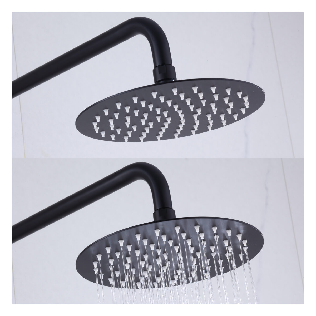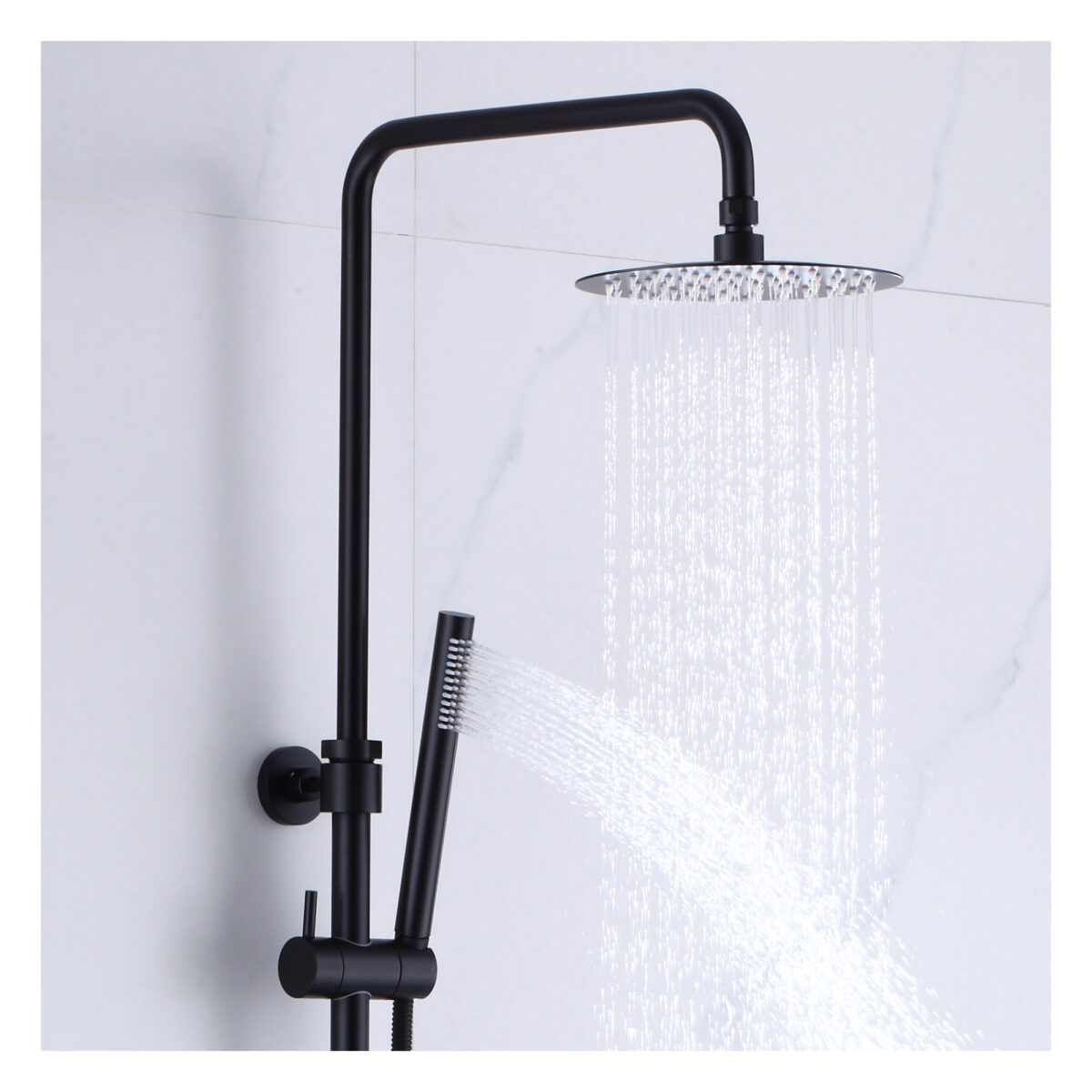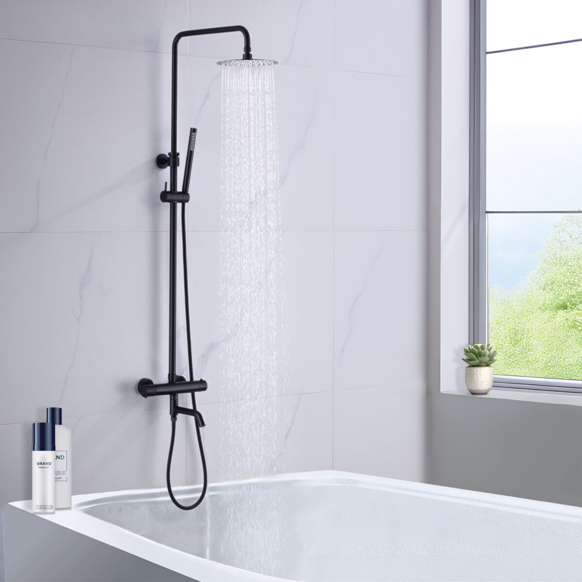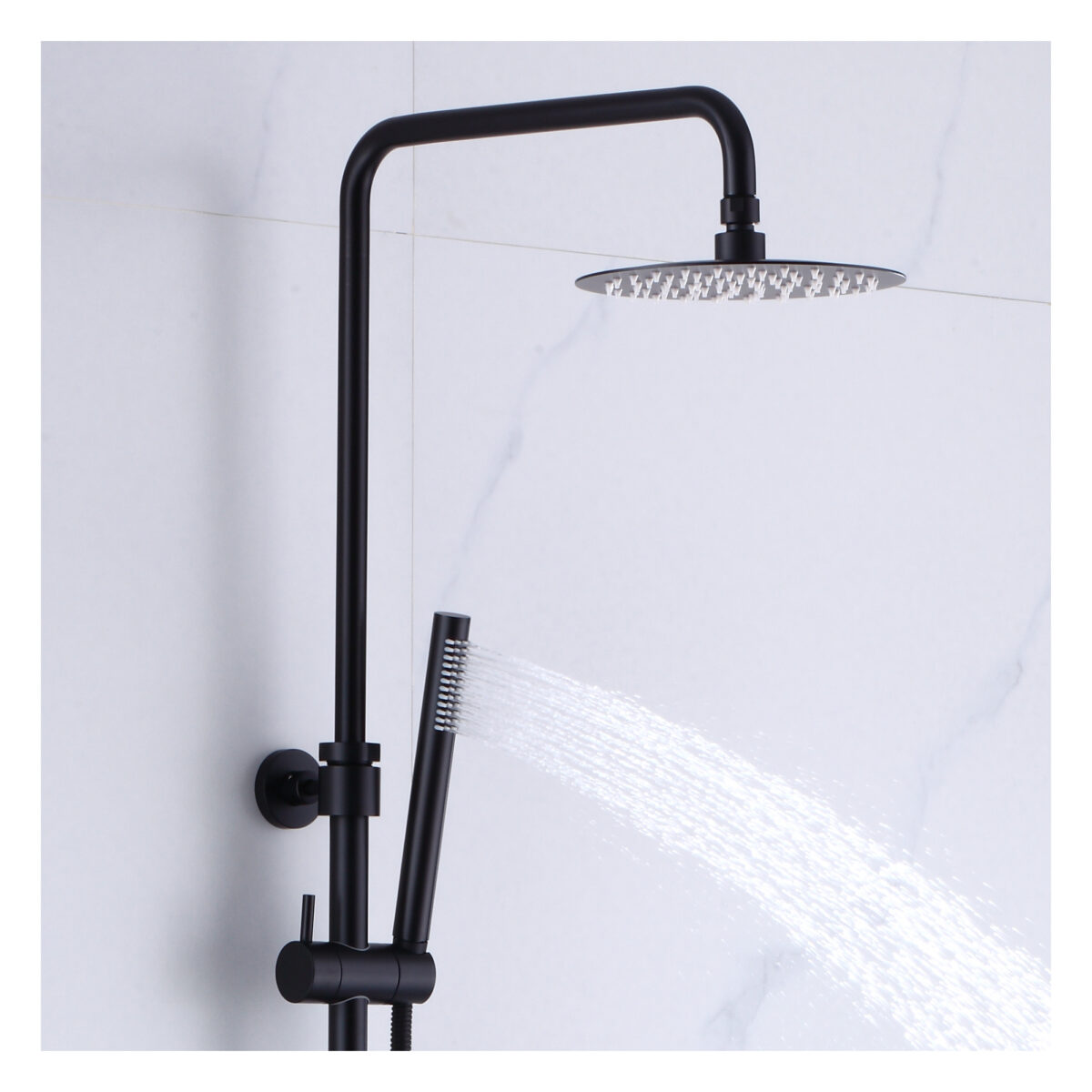 The ELITE round 4-way thermostatic shower column by akuaplus® is designed to deliver performance, reliability, and versatility for modern residential bathrooms. Constructed from brass and stainless steel, it features a solid brass valve with a thermostatic cartridge that maintains consistent and safe water temperature. The 4-way diverter allows operation of the showerhead, the hand shower, both simultaneously, or complete shut-off depending on user preference. The 8” (20 cm) round swiveling showerhead provides even water coverage, while the 1-setting hand shower offers straightforward functionality. Easy-to-clean anti-limescale nozzles simplify maintenance. The set includes a 59” (1.5 m) double interlocking stainless steel flexible hose with brass fittings, an adjustable hand shower holder, and wall mounting brackets. The flow rate is limited to 9.5 L/min (2.5 US gal/min). Overall dimensions are 10 5/8” × 20 3/32” (27 × 51 cm) with an adjustable height ranging from 28 3/4” to 43 5/16” (73 to 110 cm). A 2-way bath spout (SP7736BL) is available as an optional accessory. This shower column is cUPC certified, ensuring compliance with North American plumbing standards.