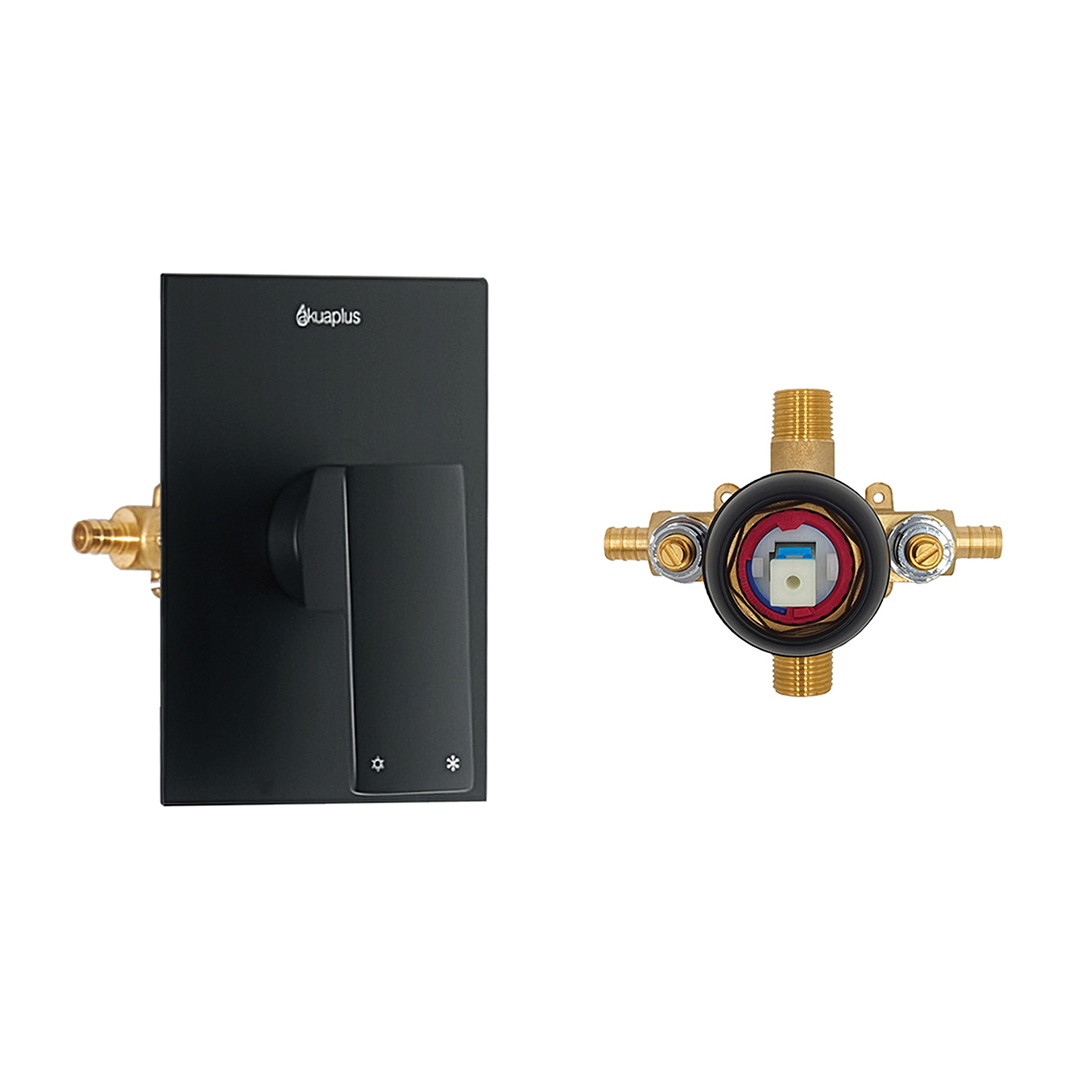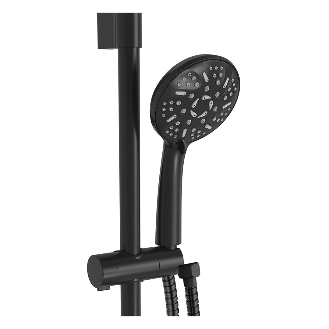 akuaplus® EMELIA Shower Kit with pressure balance valve, 9-setting handheld Shower, and adjustable 28 3/8-inch Shower post in a matte black finish.