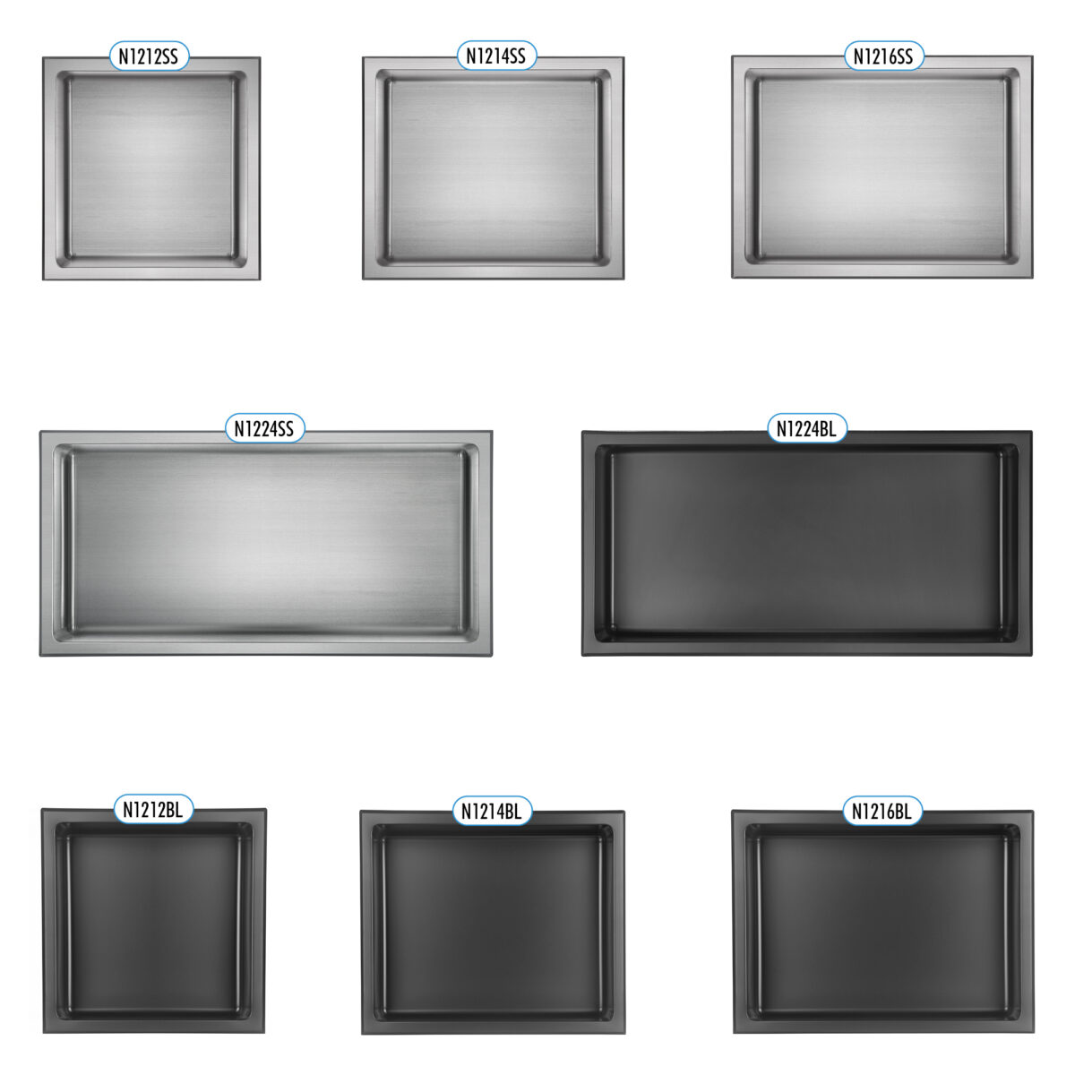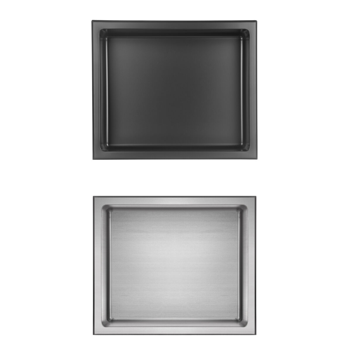 The LAYLA flush-mount shower niche by akuaplus® is constructed from 18-gauge 304 stainless steel, offering excellent corrosion resistance and superior durability for residential applications. With a 4" depth (10.2 cm), it is available in multiple sizes to accommodate various bathroom layouts. It is ideal as a recessed stainless steel shower niche, modern wall niche, or bathroom wall shelf. Available in matte black baked electrostatic finish or brushed stainless steel finish, it features 3/8" (1 cm) radius rounded corners for a clean and safe contemporary look. Its integrated slight slope promotes proper water dwaterfallage. Fully watertight, it is easy to clean and simple to install. It can be installed horizontally or vertically, with one or two shelves depending on the selected configuration. Designed to mount over existing wall coverings, it requires no additional tiling. This niche is cUPC certified, ensuring compliance with North American plumbing standards.