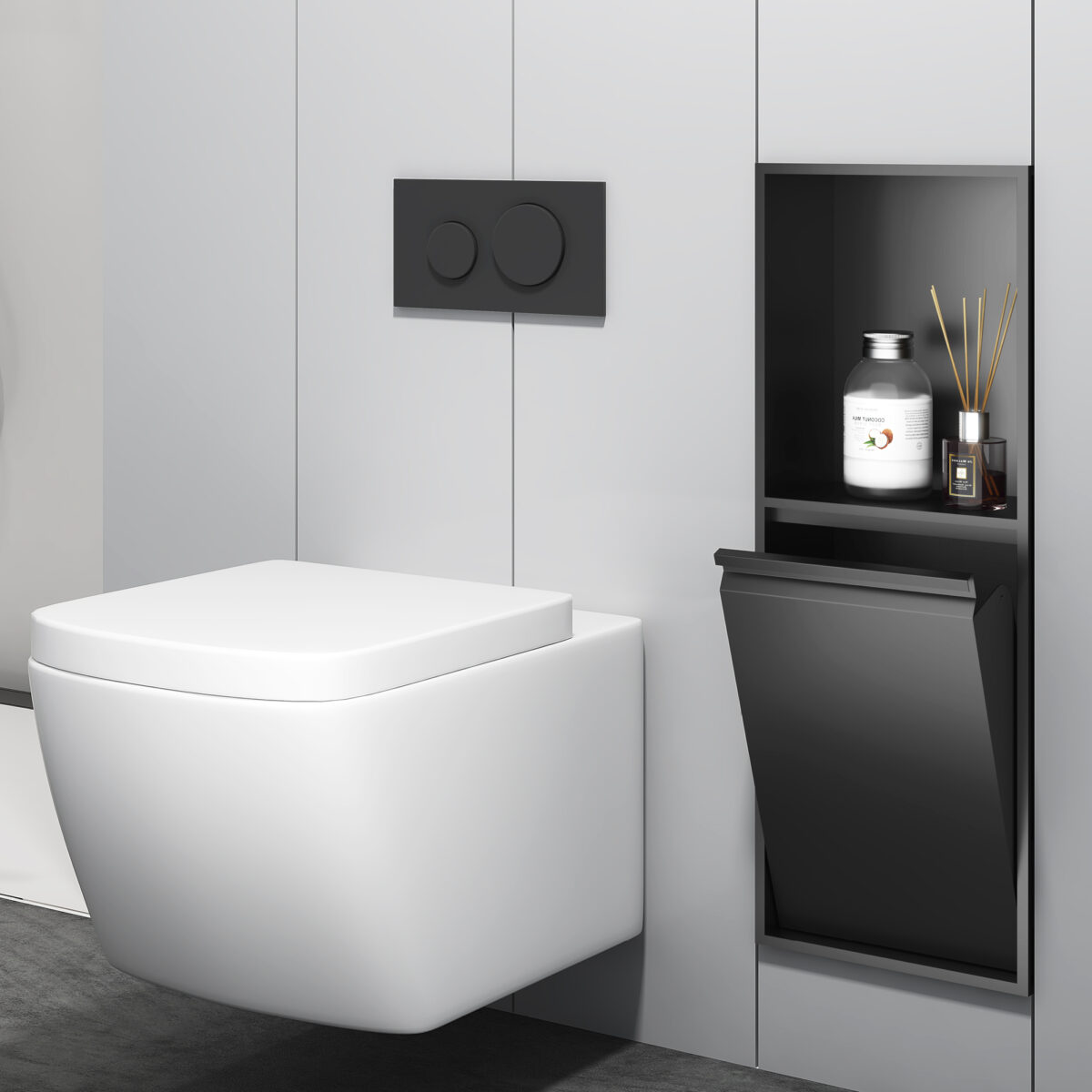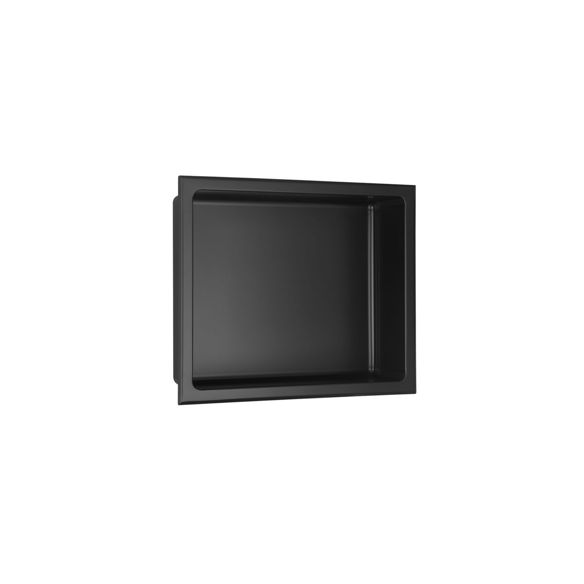 LAYLA recessed shower niche in 18 gauge 304 stainless steel with a matte black finish measuring 12" x 14" x 4" (30.5 x 35.6 x 10.2 cm), fully waterproof and cUPC certified.