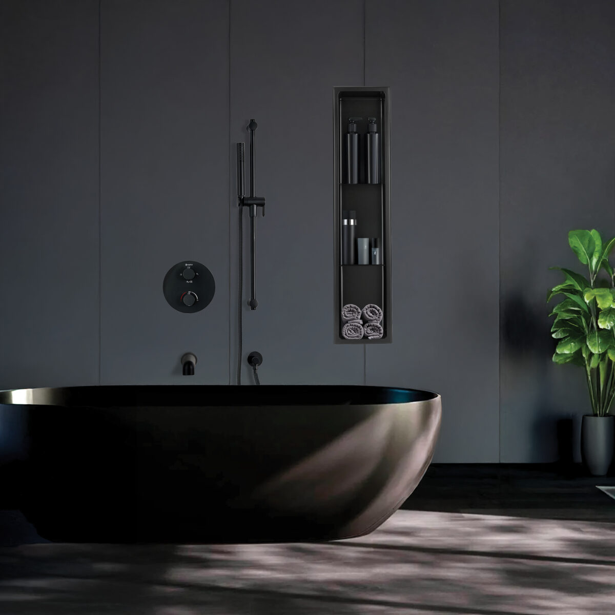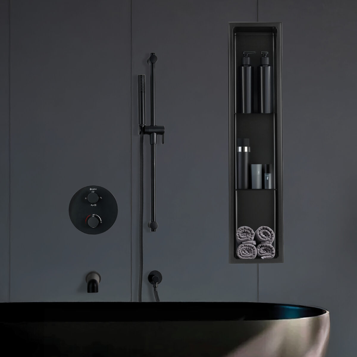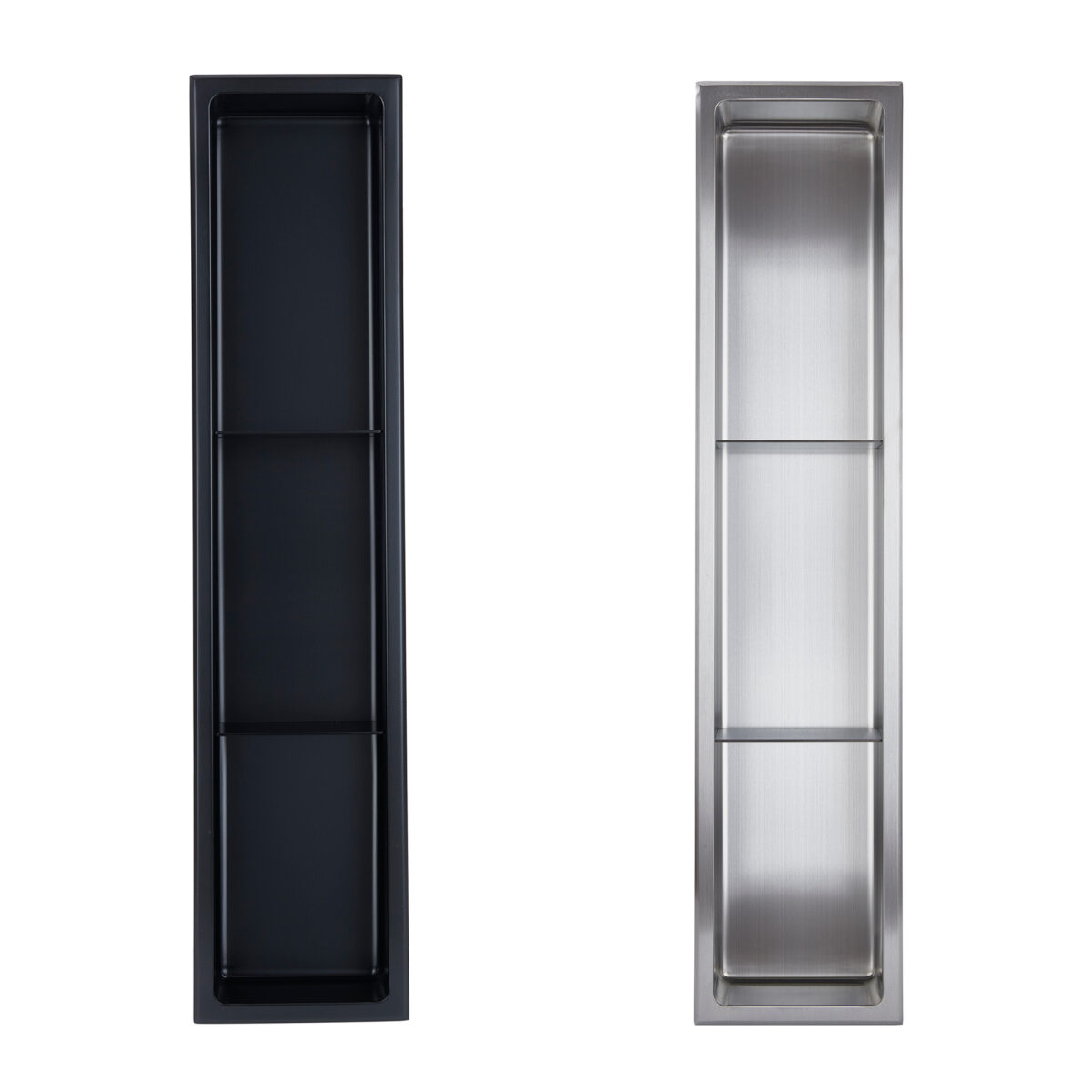 LAYLA recessed shower niche with 3 shelves in 18 gauge 304 stainless steel, matte black finish, 8" x 36" x 4" (20.3 x 91.4 x 10.2 cm), fully waterproof and cUPC certified.