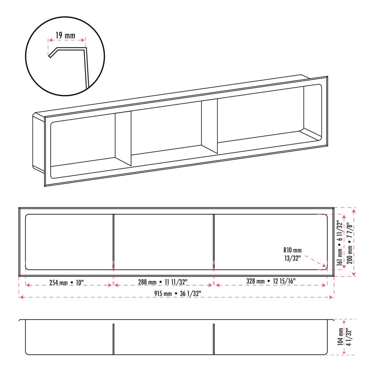 The LAYLA flush-mount shower niche by akuaplus® is constructed from 18-gauge 304 stainless steel, offering excellent corrosion resistance and superior durability for residential applications. With a 4" depth (10.2 cm), it is available in multiple sizes to accommodate various bathroom layouts. It is ideal as a recessed stainless steel shower niche, modern wall niche, or bathroom wall shelf. Available in matte black baked electrostatic finish or brushed stainless steel finish, it features 3/8" (1 cm) radius rounded corners for a clean and safe contemporary look. Its integrated slight slope promotes proper water dwaterfallage. Fully watertight, it is easy to clean and simple to install. It can be installed horizontally or vertically, with one or two shelves depending on the selected configuration. Designed to mount over existing wall coverings, it requires no additional tiling. This niche is cUPC certified, ensuring compliance with North American plumbing standards.