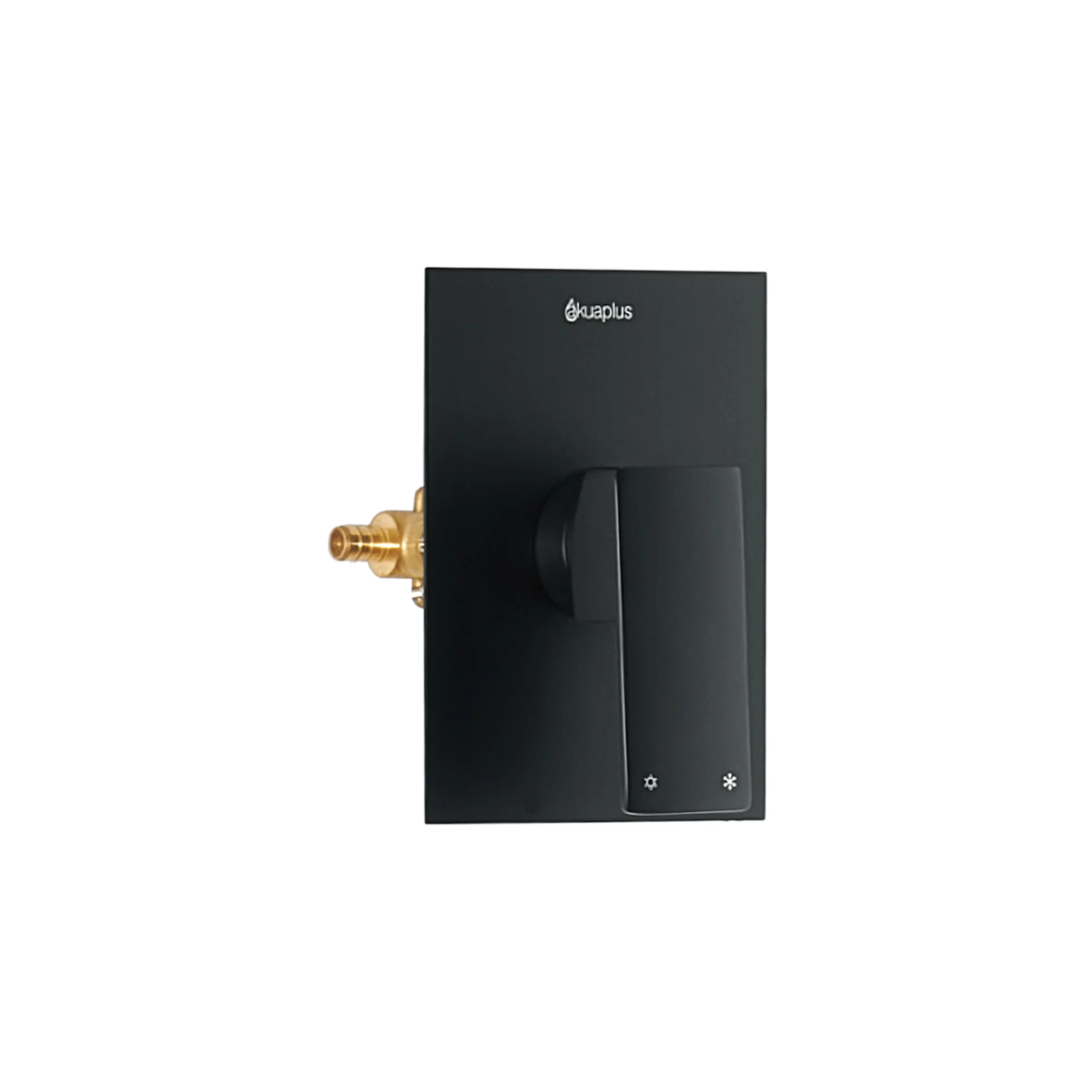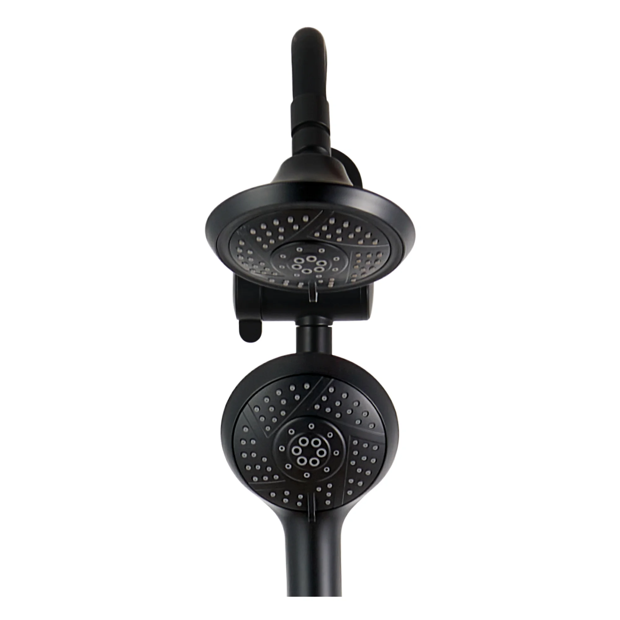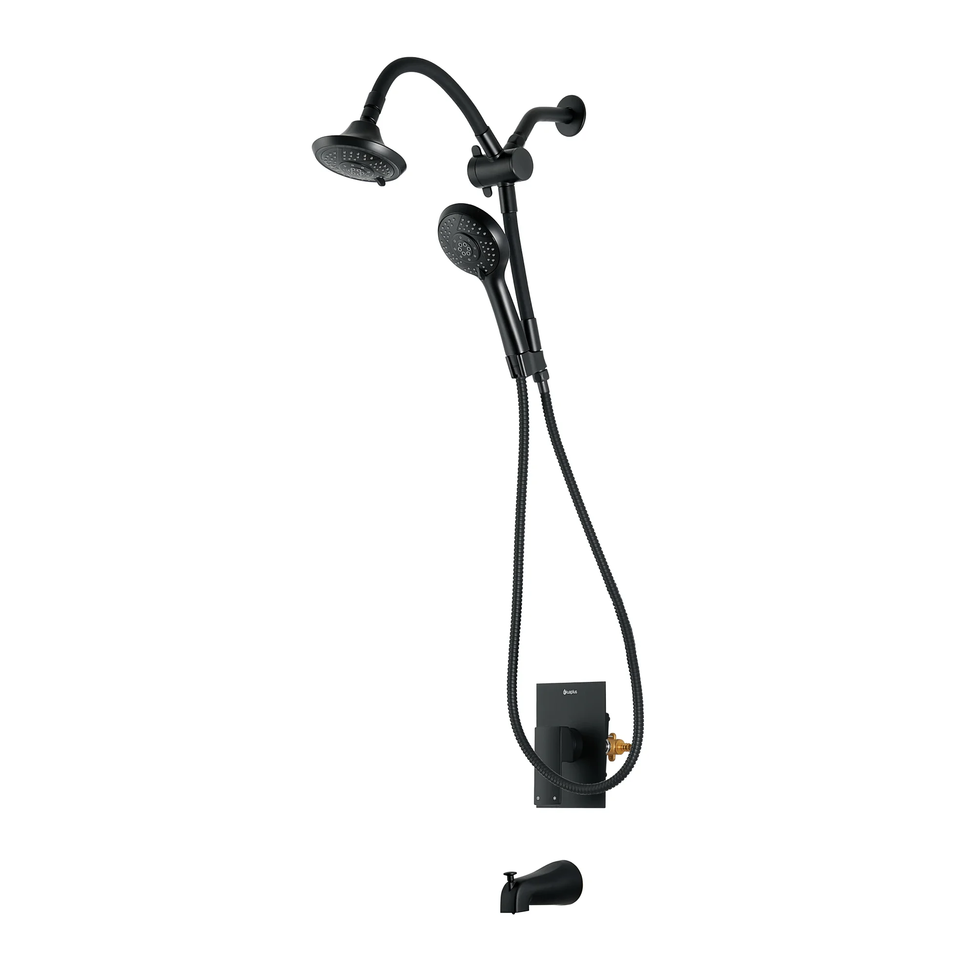 akuaplus® LILA Bath-Shower Set with pressure balance valve, flexible Shower system, 5-setting Showerhead and handheld Shower, and slip-on round Bath spout in a matte black finish.