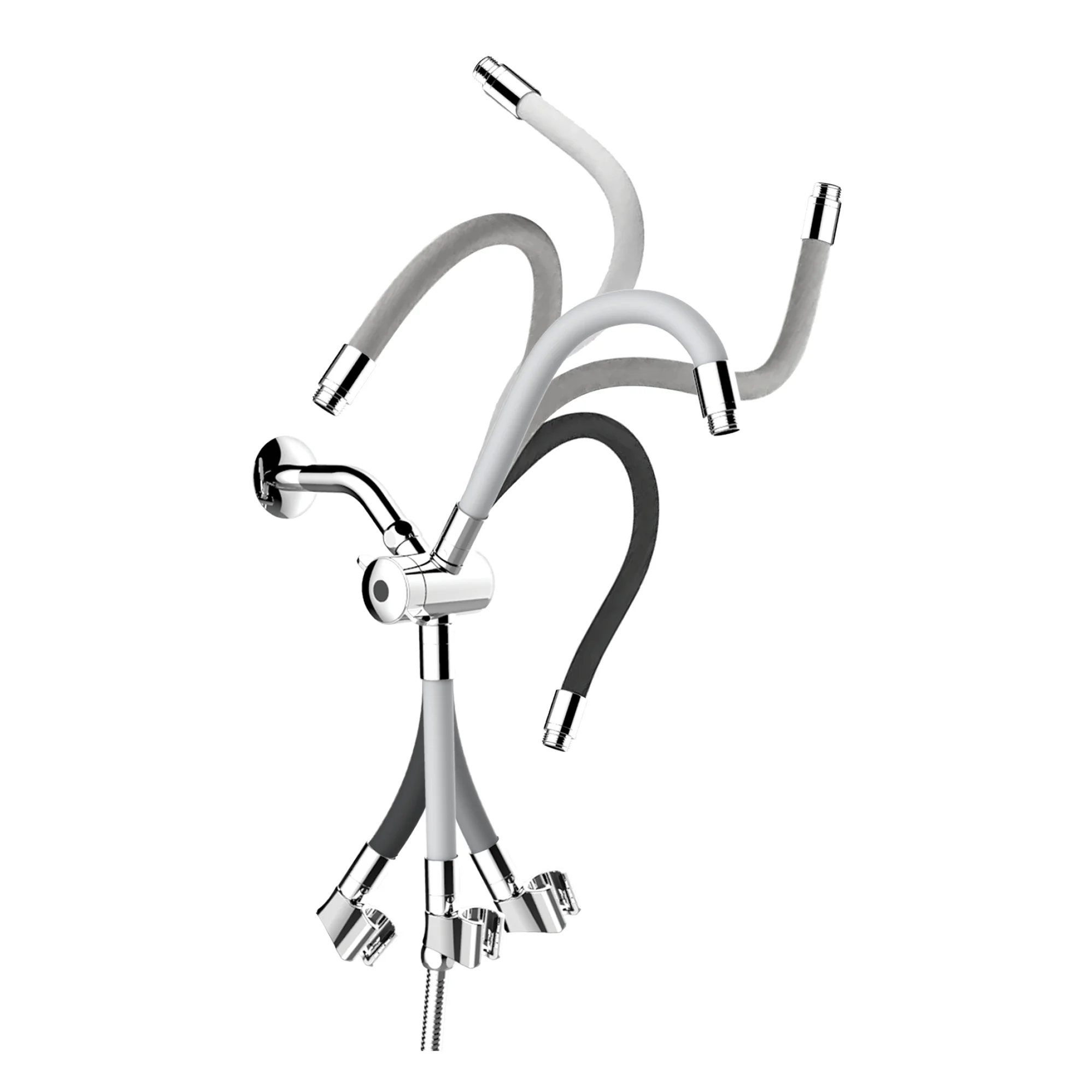 PRESSURE BALANCE BATH-SHOWER SET: Valve made of brass with pressure balance cartridge, single-handle made of zinc; Flexible shower system with 3-way diverter (shower head, handheld shower, or both simultaneously); 6-inch (15.24 cm) brass wall mount shower arm; 5-setting shower head on an adjustable 360° flexible arm; 5-setting ABS handheld shower; Easy-to-clean anti-limescale nozzles; ABS handheld shower bracket; Flexible 59-inch (1.5 m) double interlocking stainless steel hose with brass fittings; Round slip-on bath spout with pull-up diverter, 5-1/4 inches (13.3 cm) made of zinc; Flow rate of 9.5 L/min (2.5 US gal/min).