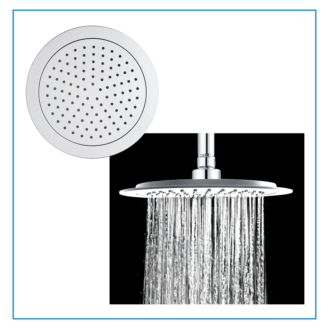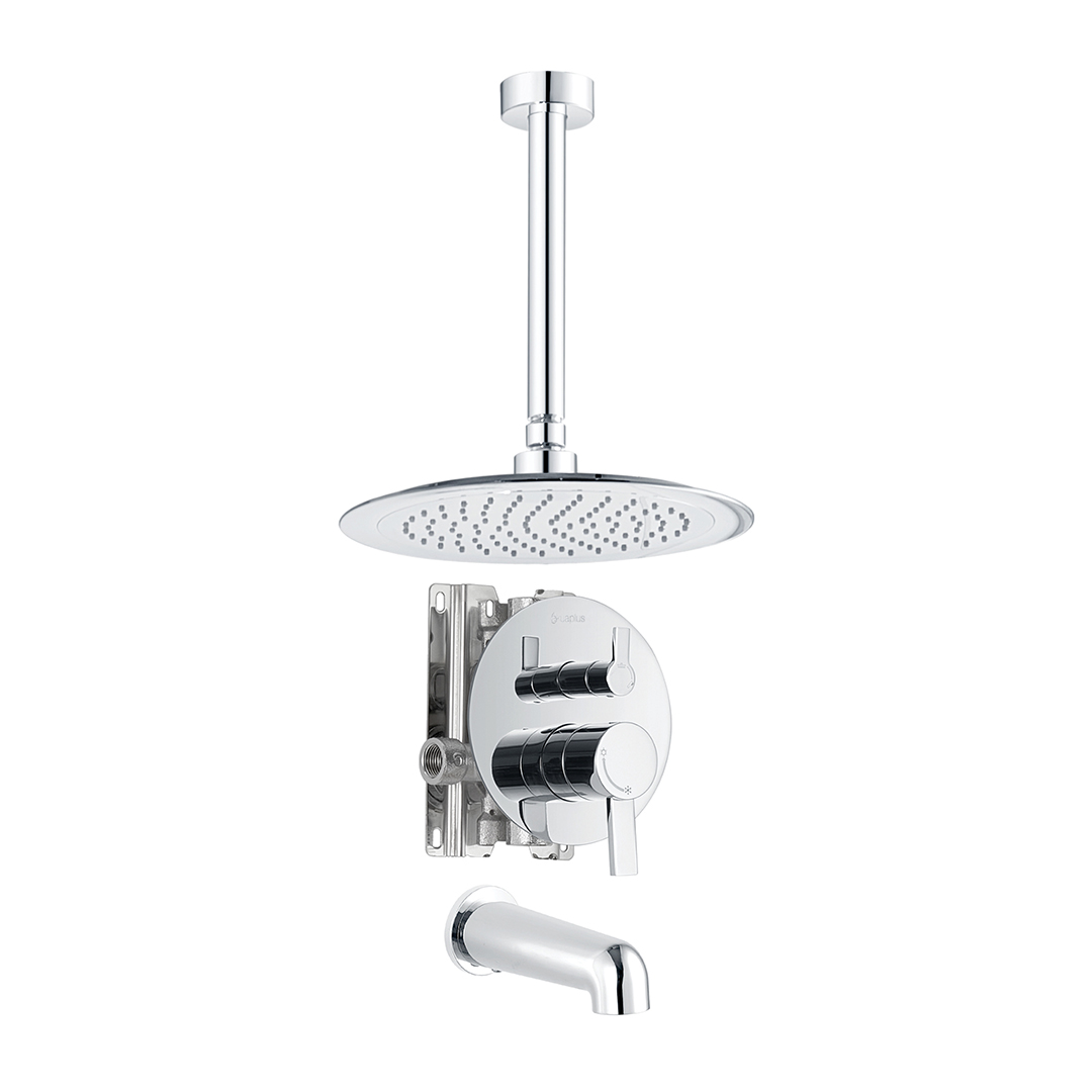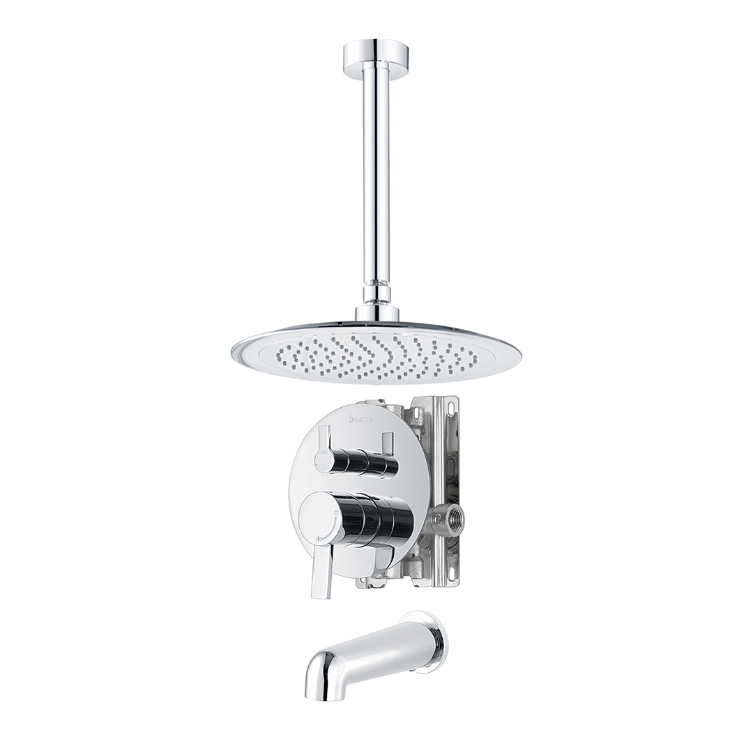 ROUND PRESSURE BALANCE BATH-SHOWER SET: Valve made of brass with pressure balance cartridge; 3-way diverter (shower head, bath spout or both simultanously); 8-inch (20.3 cm) ceiling mount brass shower arm; 9-1/2 inch (24.13 cm) ABS shower head, swivelling with brass ball joint; Easy-to-clean anti-limescale nozzles; Slip-on bath spout, 7-1/2 inches (19 cm), made of zinc; Flow rate of 9.5 L/min (2.5 US gal/min).