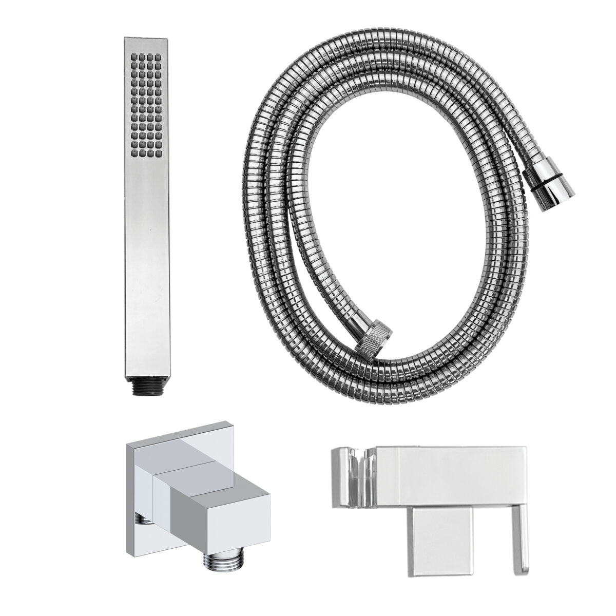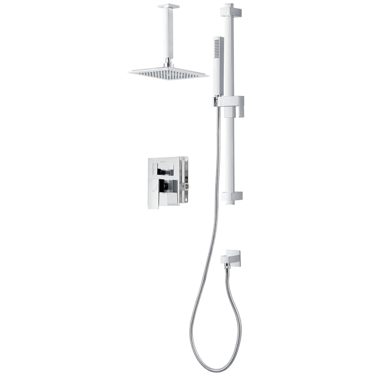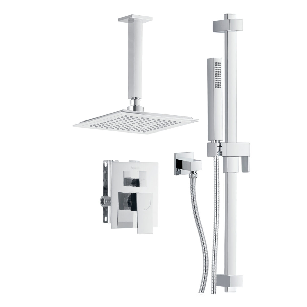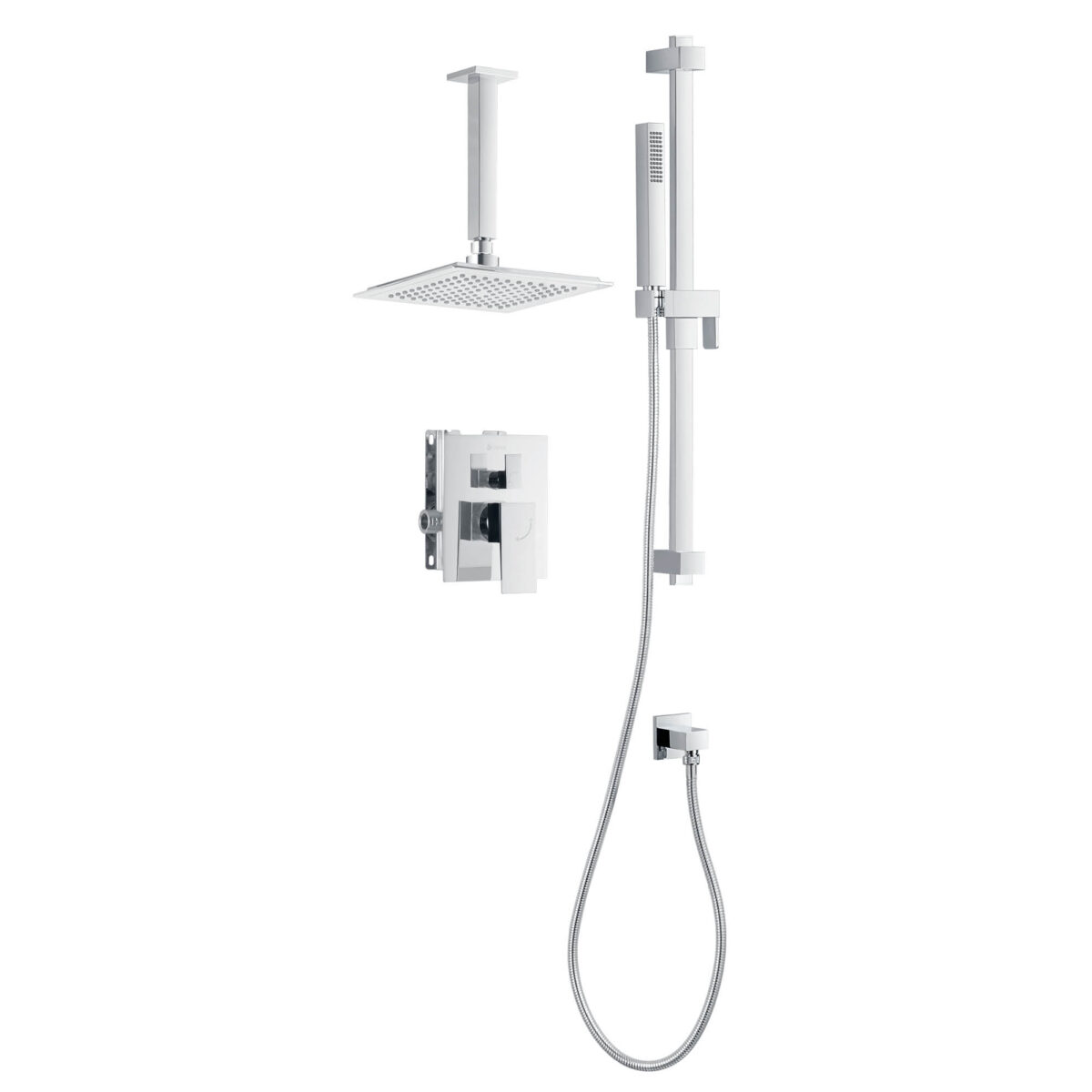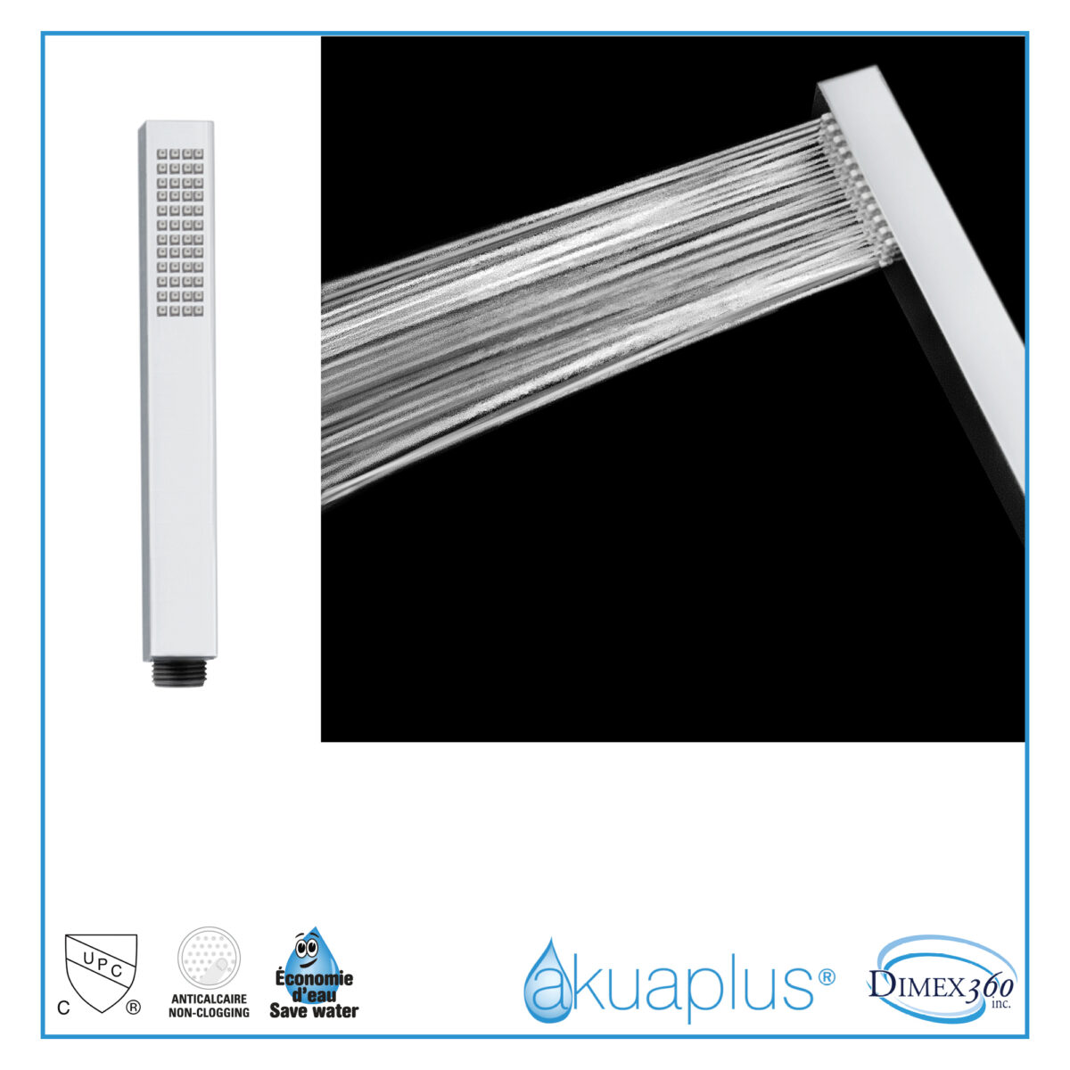 The akuaplus® pressure balance shower set is designed to deliver performance, versatility, and stability for modern residential bathroom installations. The brass shower valve features a pressure balance cartridge that maintains consistent water temperature while minimizing sudden pressure fluctuations. It includes a 3-way diverter allowing use of the showerhead, the hand shower, or both simultaneously. The valve includes an integrated shut-off valve and 1/2" female threaded connections compatible with standard plumbing installations. The set includes an 8" (20.3 cm) ceiling mount brass shower arm with flange for secure overhead installation. The 9" (22.86 cm) ABS showerhead swivels on a brass ball joint for precise directional adjustment. Easy-to-clean anti-limescale nozzles ensure simplified maintenance and long-lasting performance. A 29 3/4" (75.5 cm) stainless steel shower post with adjustable ABS hand shower bracket provides ergonomic flexibility. The 1-setting ABS hand shower offers straightforward functionality. The 59" (1.5 m) double interlocking stainless steel hose with brass fittings ensures durability and corrosion resistance. A brass elbow fitting (male/male, 1/2") is included to complete the installation. Maximum flow rate is 9.5 L/min (2.5 US gal/min). Designed for residential applications, this set is cUPC certified, ensuring compliance with North American plumbing standards.