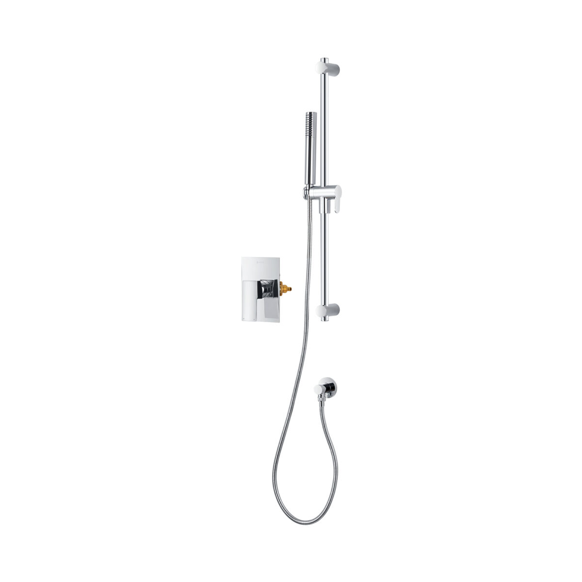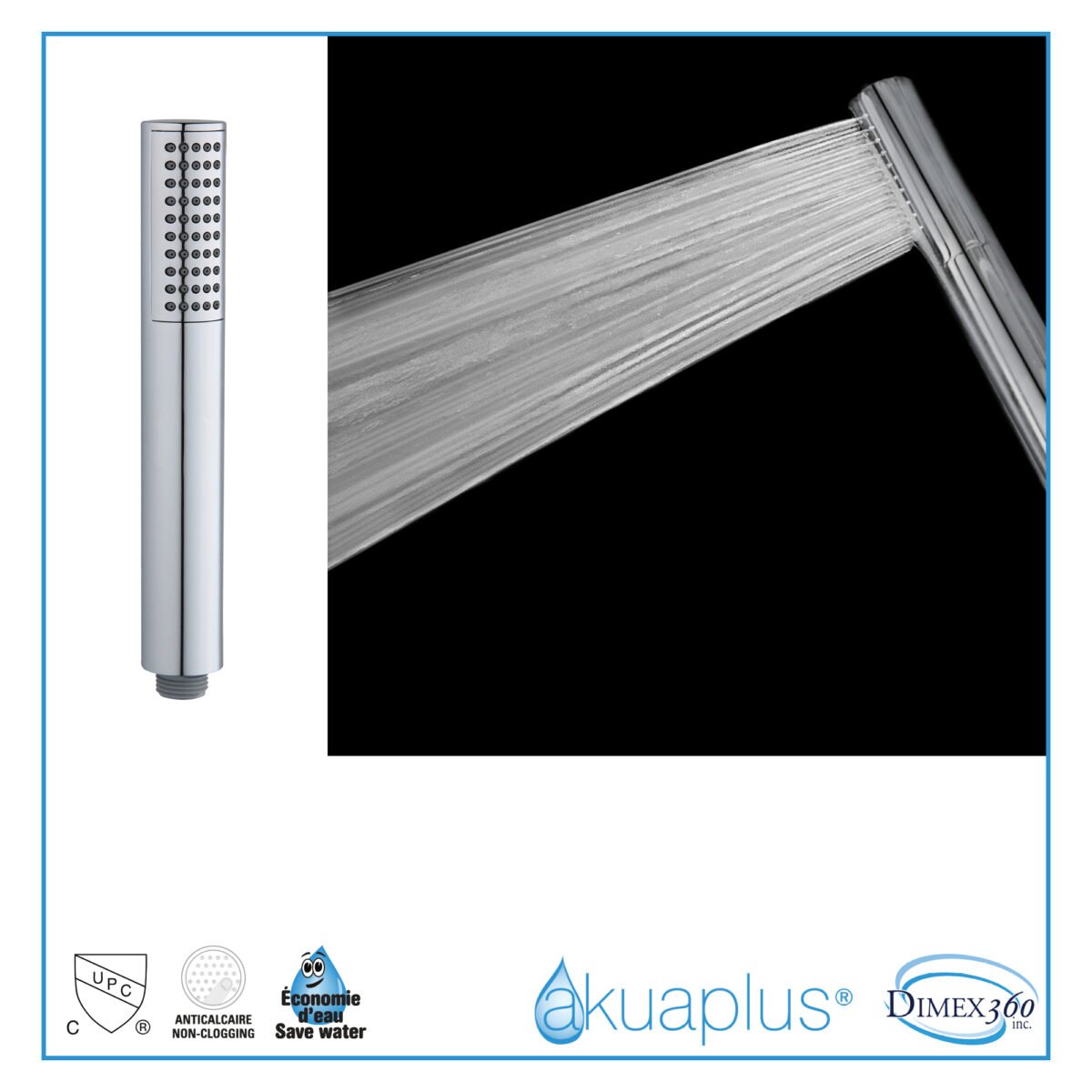The akuaplus® pressure balance shower set is designed to provide reliability, stability, and durability for modern residential bathroom installations. The shower valve, made of brass, stainless steel, and zinc, features a pressure balance cartridge that maintains consistent water temperature while minimizing sudden pressure fluctuations. It includes a single handle for precise flow and temperature control. The water inlet is compatible with a 1/2" PEX connection and includes an integrated stop valve for secure and dependable installation. The system includes a 29 3/4" (75.5 cm) stainless steel wall bar with an adjustable ABS hand shower bracket for flexible and ergonomic installation. The round 1-setting ABS hand shower features easy-to-clean anti-limescale nozzles for simplified maintenance and long-lasting performance. A 59" (1.5 m) double interlocking stainless steel hose ensures durability and corrosion resistance. A 1/2" brass elbow fitting (male/male) is included to complete the installation. Maximum flow rate is 9.5 L/min (2.5 US gal/min). Designed for residential applications, this set is cUPC certified, ensuring compliance with North American plumbing standards.