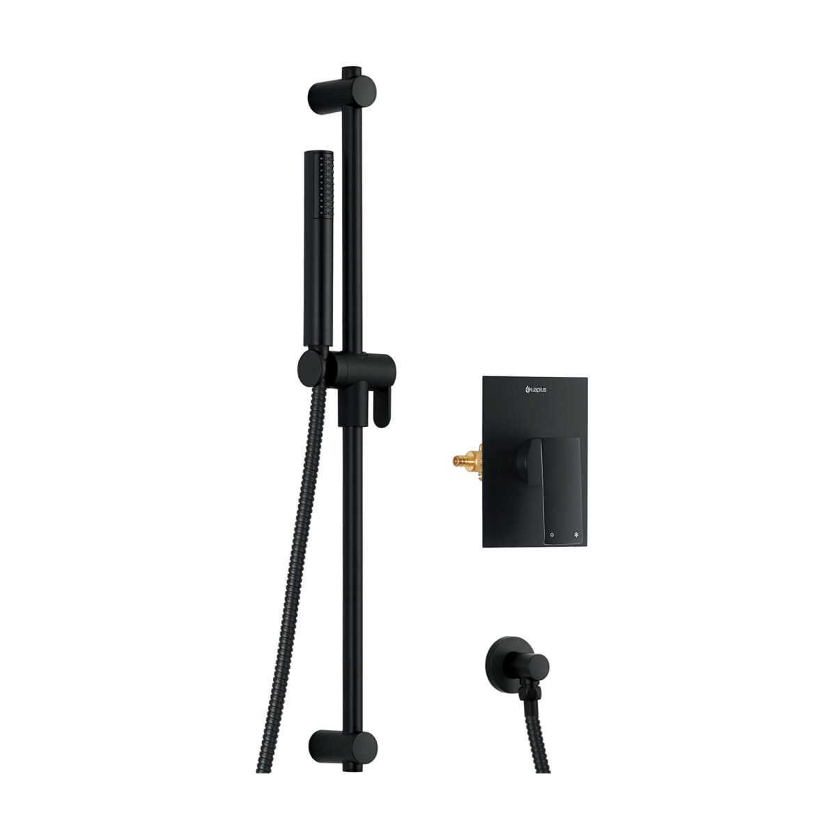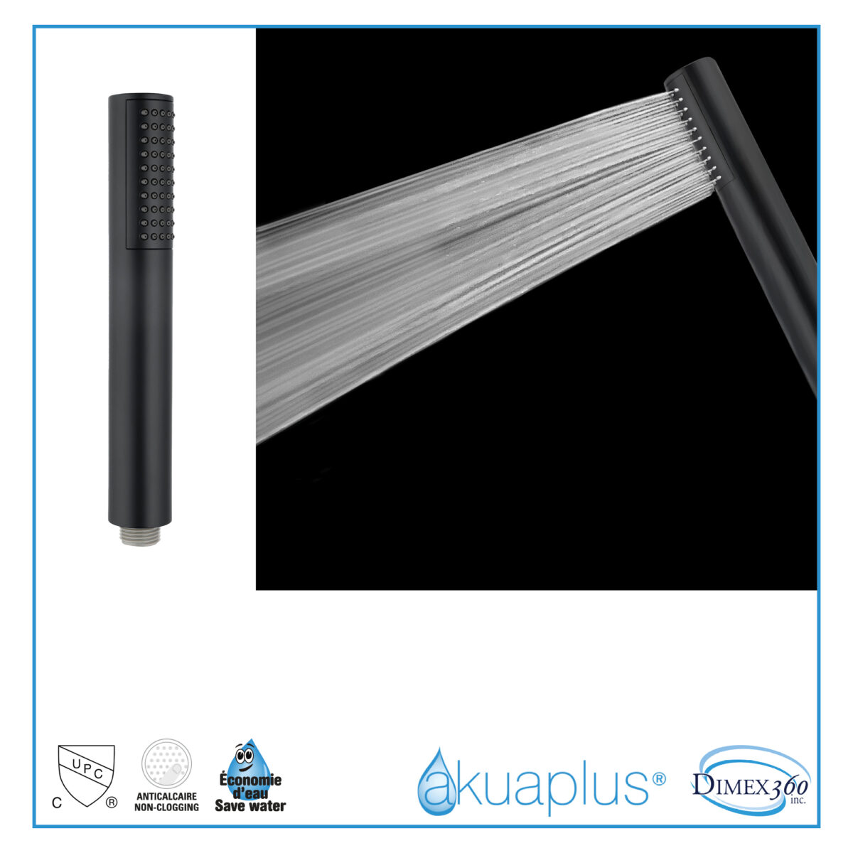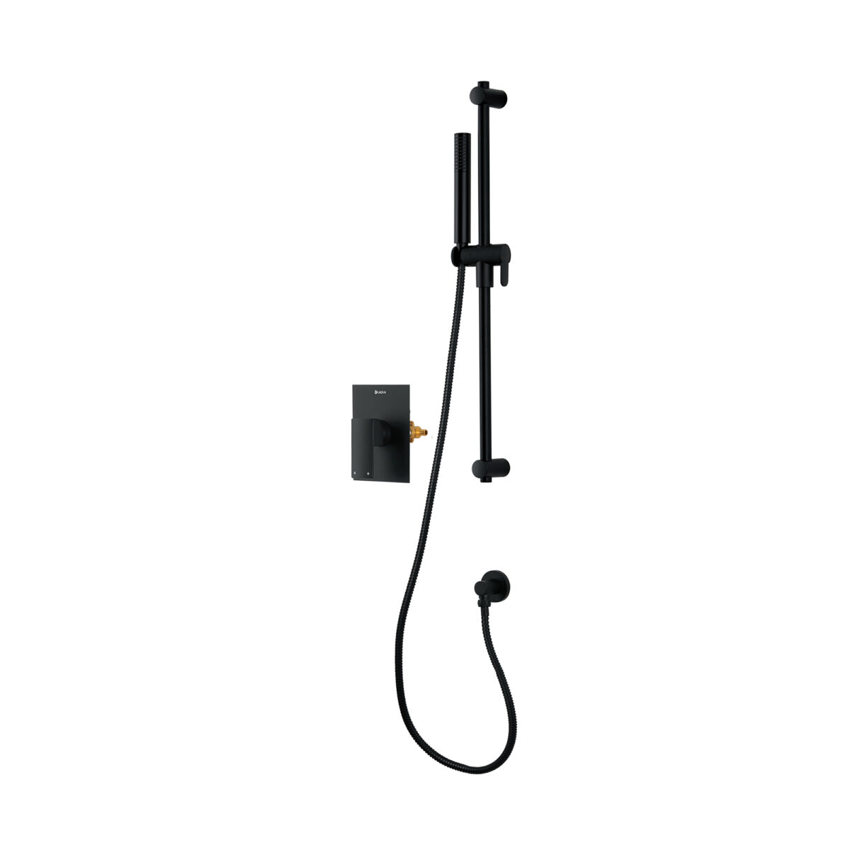 akuaplus® Pressure Balance Shower Kit with brass valve, single-setting hand Shower, adjustable 29 3/4-inch wall bar, and flexible stainless steel hose in a matte black finish.