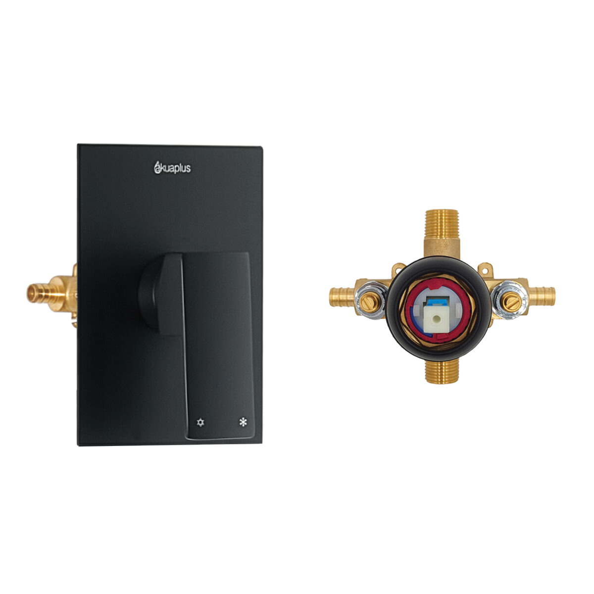 The akuaplus® pressure balance shower set is designed to provide reliability, stability, and durability for modern residential bathroom installations. The shower valve, made of brass, stainless steel, and zinc, features a pressure balance cartridge that maintains consistent water temperature while minimizing sudden pressure fluctuations. It includes a single handle for precise flow and temperature control. The water inlet is compatible with a 1/2" PEX connection and includes an integrated stop valve for secure and dependable installation. The system includes a 29 3/4" (75.5 cm) stainless steel wall bar with an adjustable ABS hand shower bracket for flexible and ergonomic installation. The round 1-setting ABS hand shower features easy-to-clean anti-limescale nozzles for simplified maintenance and long-lasting performance. A 59" (1.5 m) double interlocking stainless steel hose ensures durability and corrosion resistance. A 1/2" brass elbow fitting (male/male) is included to complete the installation. Maximum flow rate is 9.5 L/min (2.5 US gal/min). Designed for residential applications, this set is cUPC certified, ensuring compliance with North American plumbing standards.