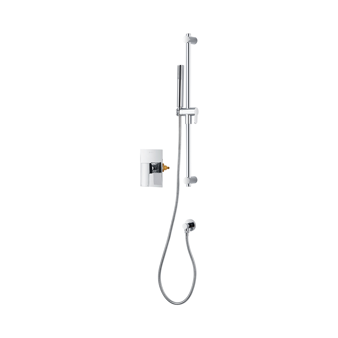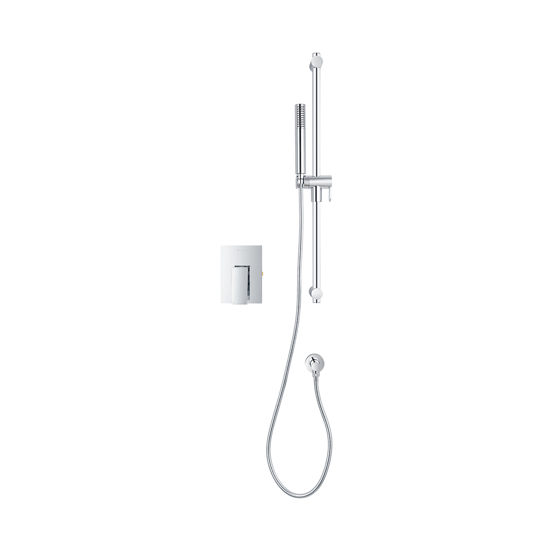 akuaplus® Pressure Balance Shower Kit with brass valve, single-setting hand Shower, adjustable 29 3/4-inch wall bar, and flexible stainless steel hose in a chrome finish.