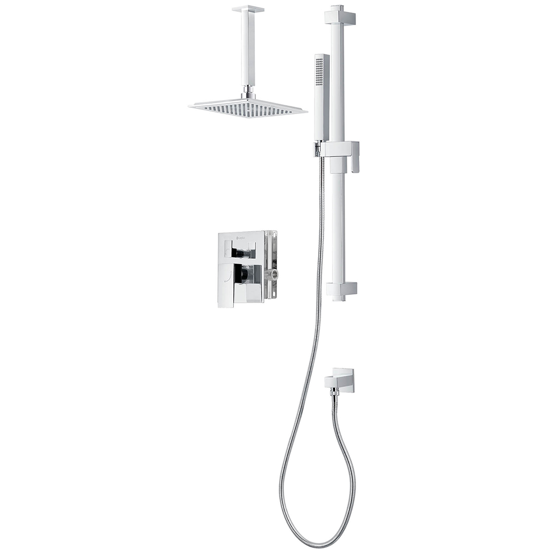 SQUARE PRESSURE BALANCE SHOWER SET: Valve made of brass with pressure balance cartridge; 3-way diverter (shower head, handheld shower or both simultanously); 8-inch (20.3 cm) ceiling mount brass shower arm; 9-inch (22.86 cm) ABS shower head, swivelling with brass ball joint; 31-1/2 inch (80 cm) stainless steel wall mount shower post with adjustable ABS handheld shower bracket; 1-setting ABS handheld shower; Easy-to-clean anti-limescale nozzles; Flexible and extendable 59-inch (1.5 m) double interlocking stainless steel hose with brass fittings; Brass elbow fitting; Flow rate of 9.5 L/min (2.5 US gal/min).