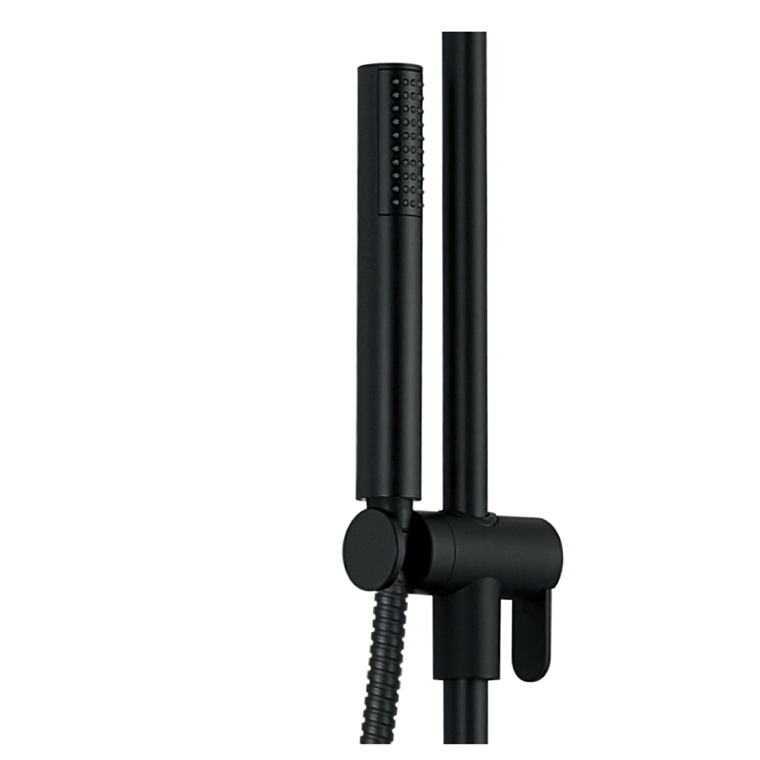 Round adjustable Shower post system with 1-setting handheld Shower in a matte black finish.