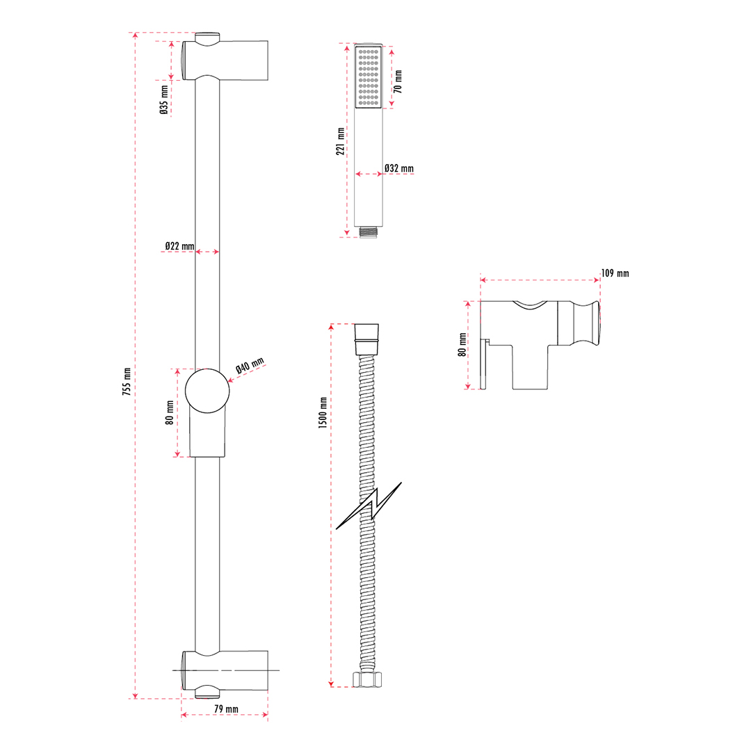 ROUND ADJUSTABLE SHOWER POST SYSTEM: Stainless steel 29 3/4 inch (75,5 cm) shower post; 1-setting ABS handheld shower with easy-to-clean anti-limescale nozzles; Adjustable handheld shower bracket made of ABS; Flexible and extendable 59-inch (1.5 m) double interlocking stainless steel hose with brass fittings; Flow rate of 9.5 L/min (2.5 US gal/min); Wall-mounting hardware included.