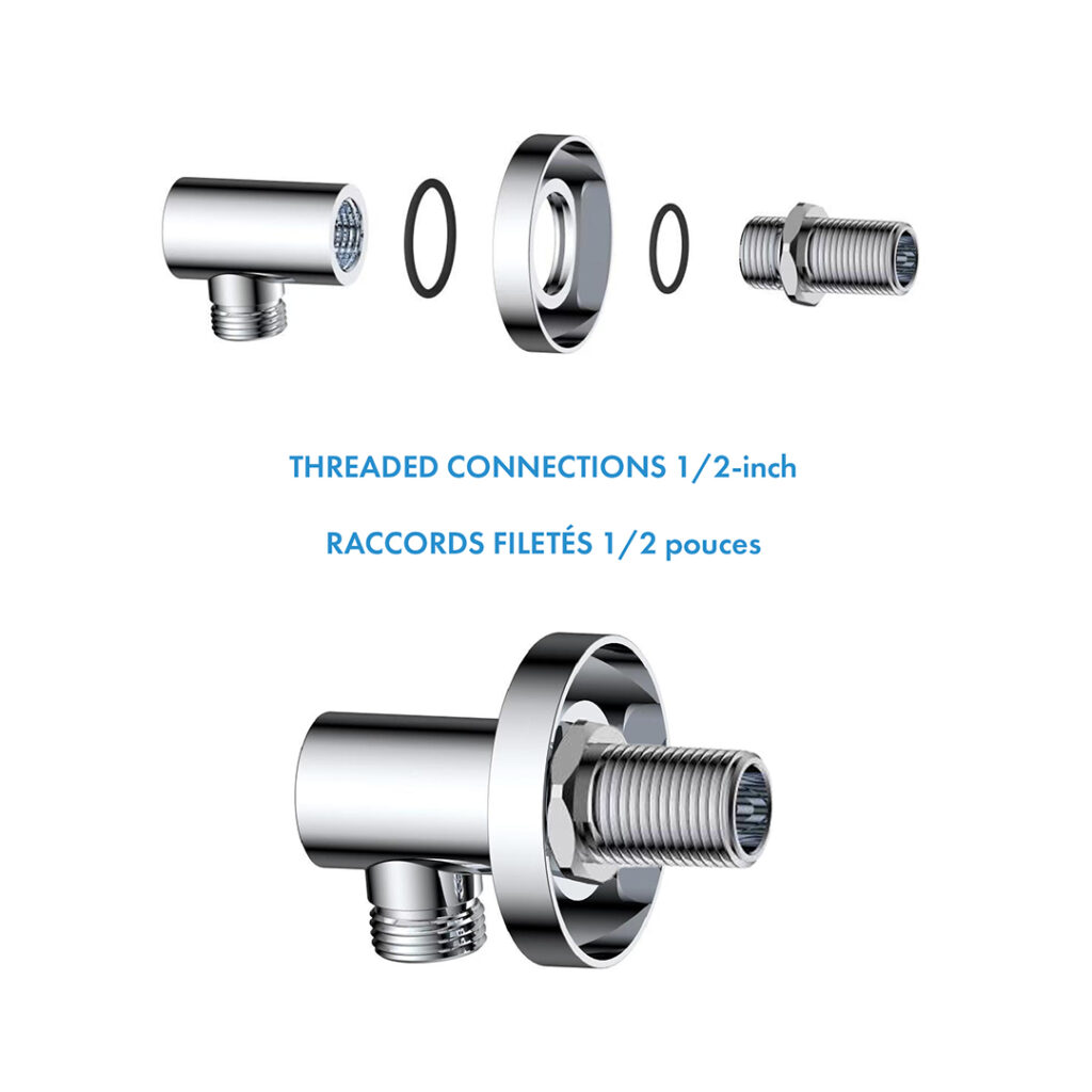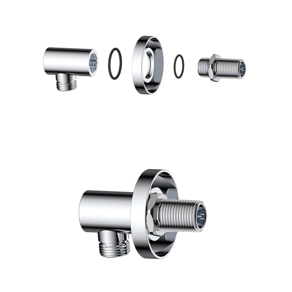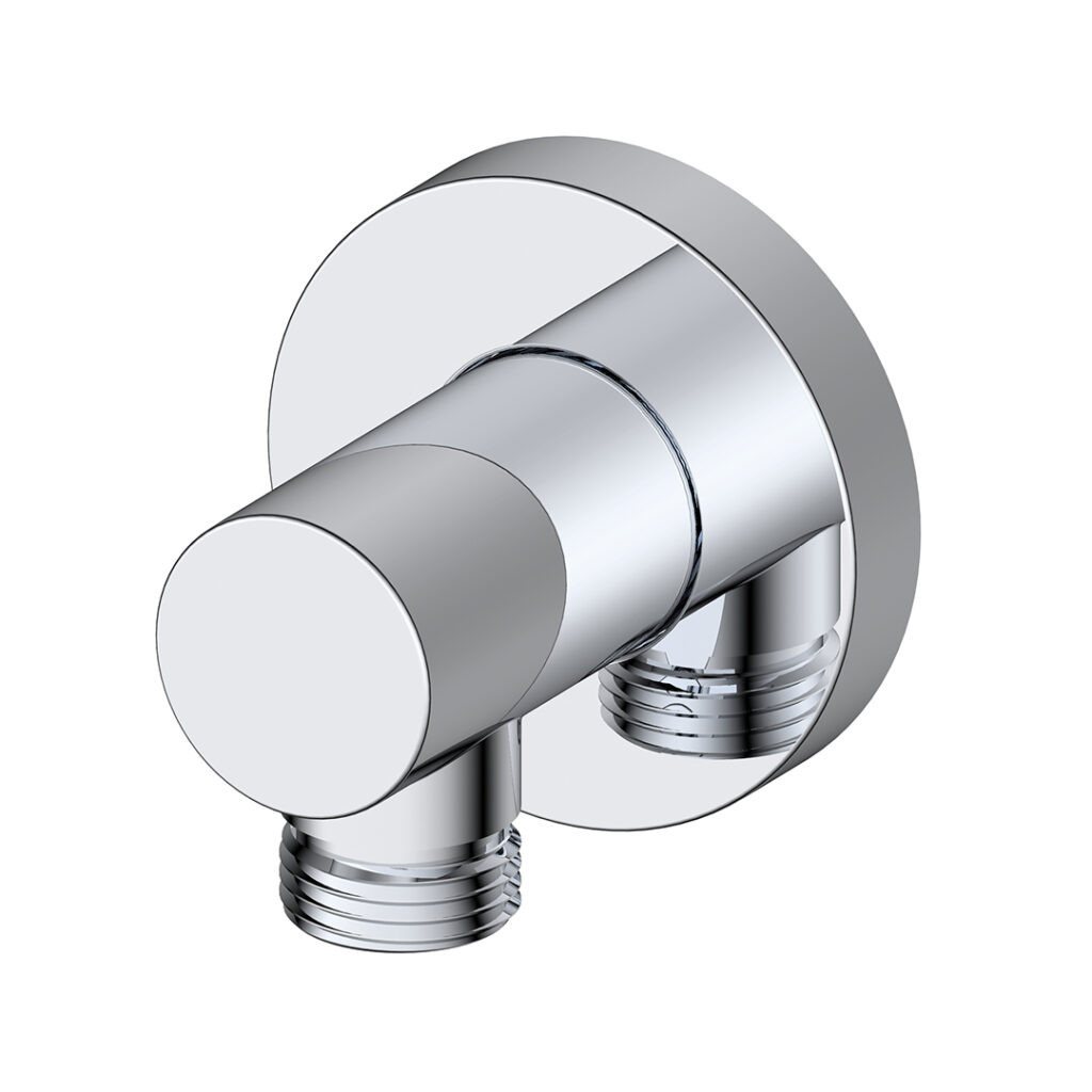 ROUND ELBOW FITTING: Made of brass; Connector for shower hose; 1/2-inch threaded connections.