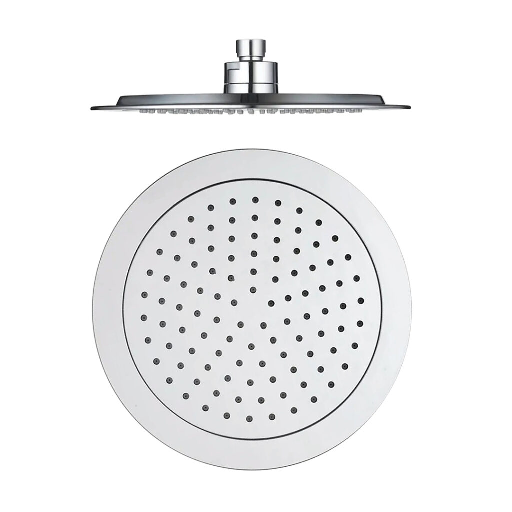 ROUND SHOWER HEAD: Made of ABS; Swivelling; Brass ball joint; Easy-to-clean anti-limescale nozzles; 9-1/2 inches (24.13 cm); Flow rate of 9.5 L/min (2.5 US gal/min).