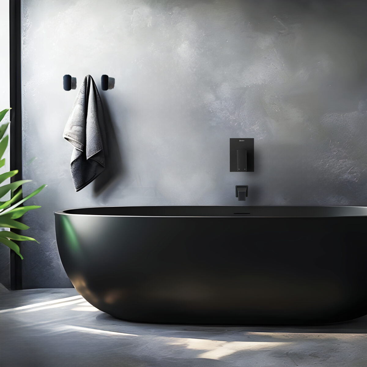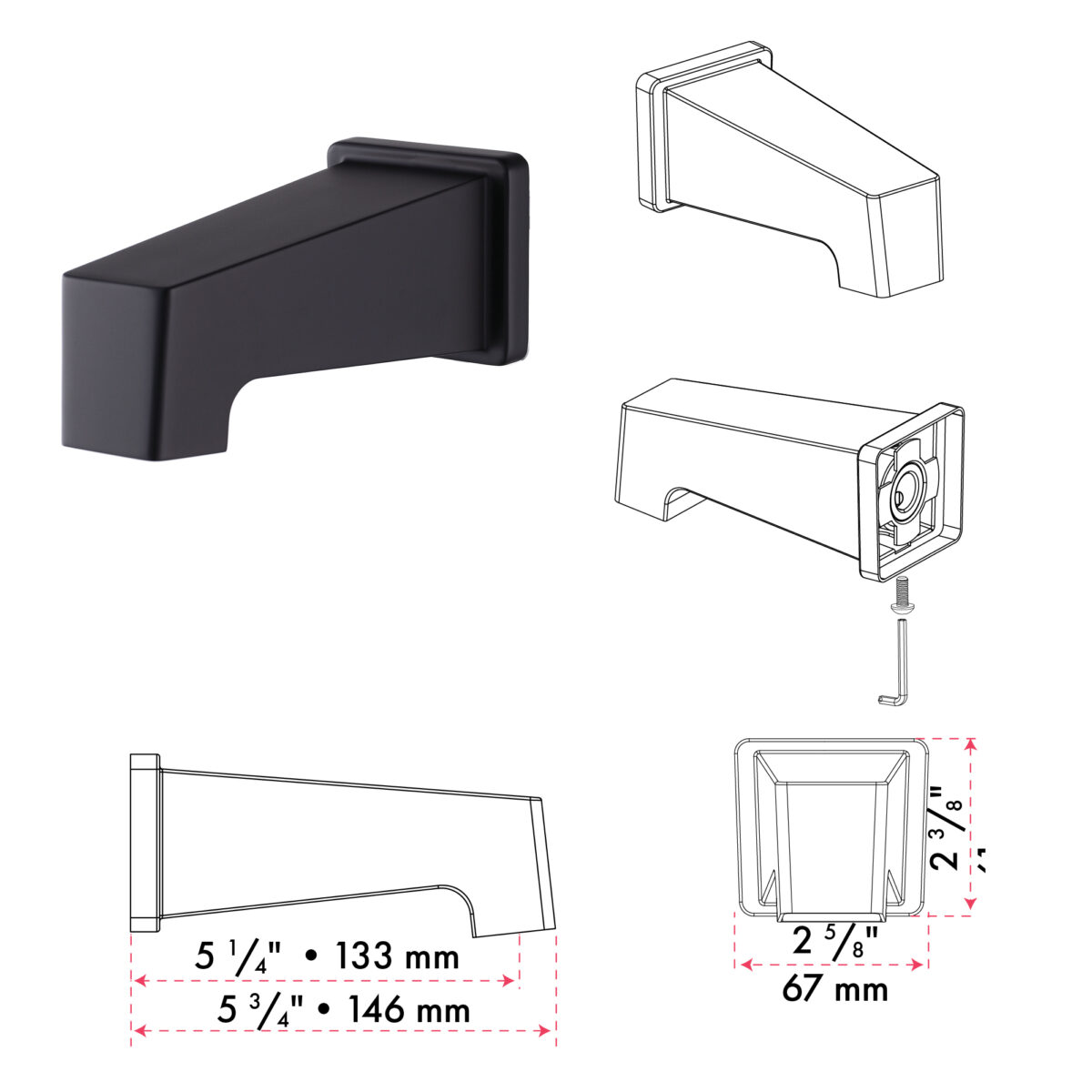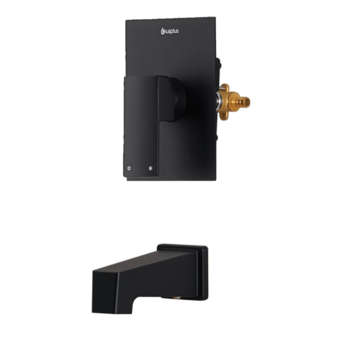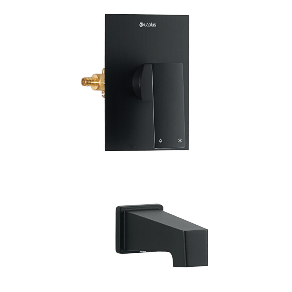 SHELA single-handle bath set with pressure balance valve, 1/2" PEX connection and square tub spout in a matte black finish by akuaplus®.